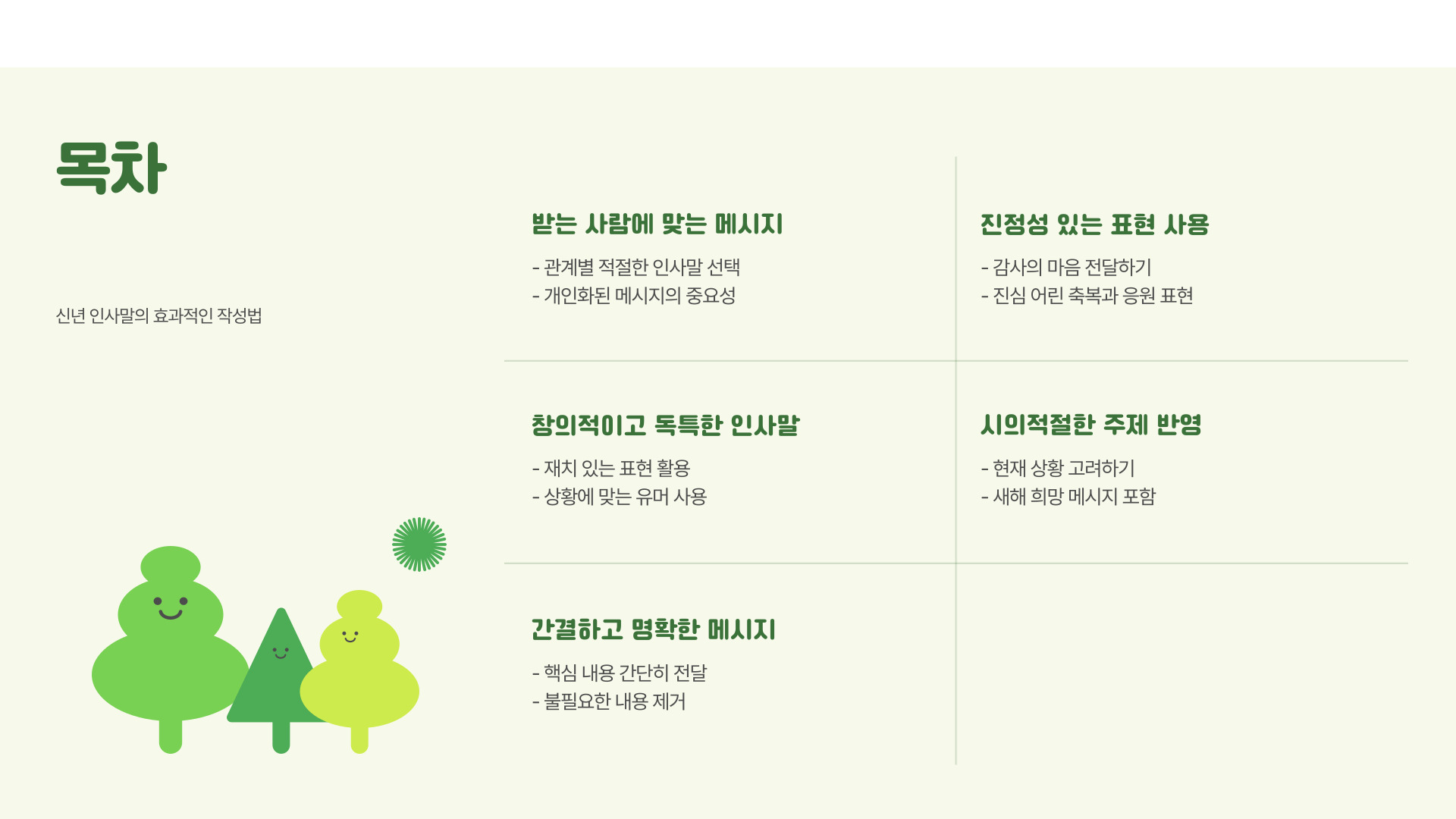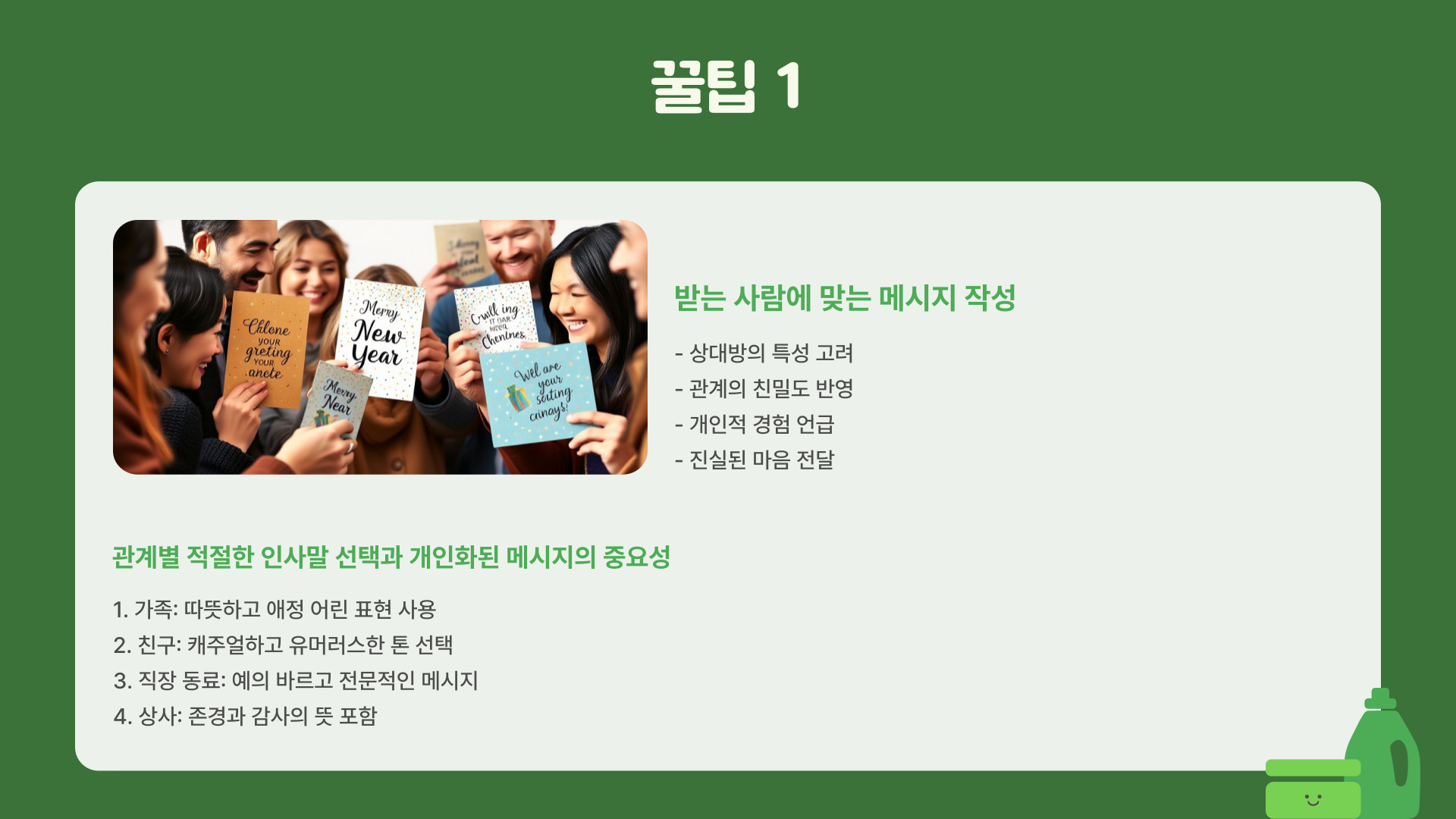 인사말은 단순한 메시지를 넘어서, 상대방에 대한 배려와 관심을 담는 것이 중요합니다. 상대방의 상황이나 고민을 이해하고, 그에 맞는 응원의 메시지를 담아보세요. "올해는 당신의 꿈이 이루어지길 바랍니다." 또는 "올해도 건강하고 행복한 한 해가 되길 기원합니다."와 같은 문구는 상대방에게 큰 힘이 될 수 있습니다.