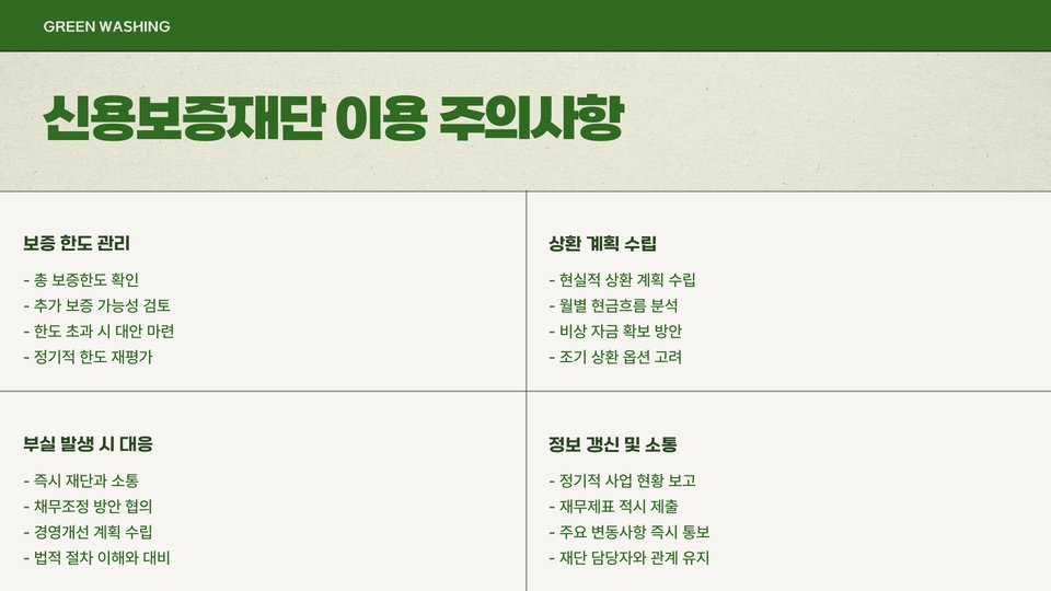 한편으로는 보증료 등의 비용이 발생한다는 점도 유의해야 합니다. 이러한 비용을 고려하지 않으면 오히려 기업의 재정에 부담이 될 수 있으므로, 신중한 판단이 필요합니다. 각 신용보증재단의 보증 조건과 요율을 비교하는 것이 중요합니다.