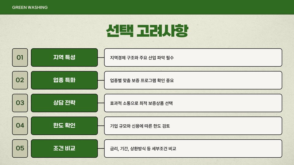 - 보증 한도, 보증료, 서비스 품질 등을 고려하여 선택해야 함