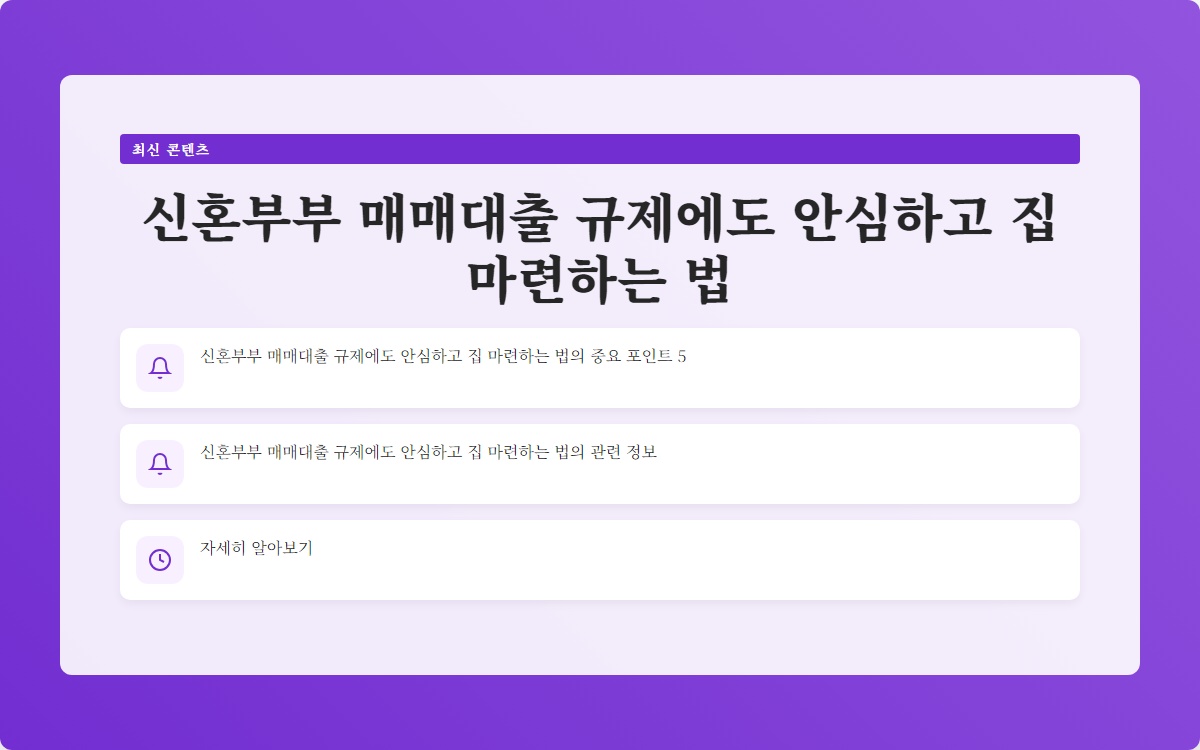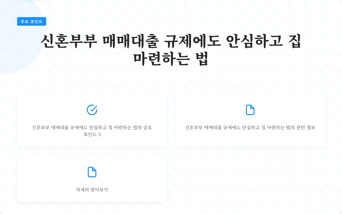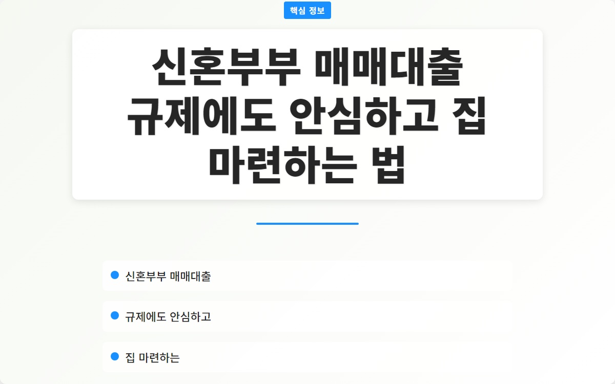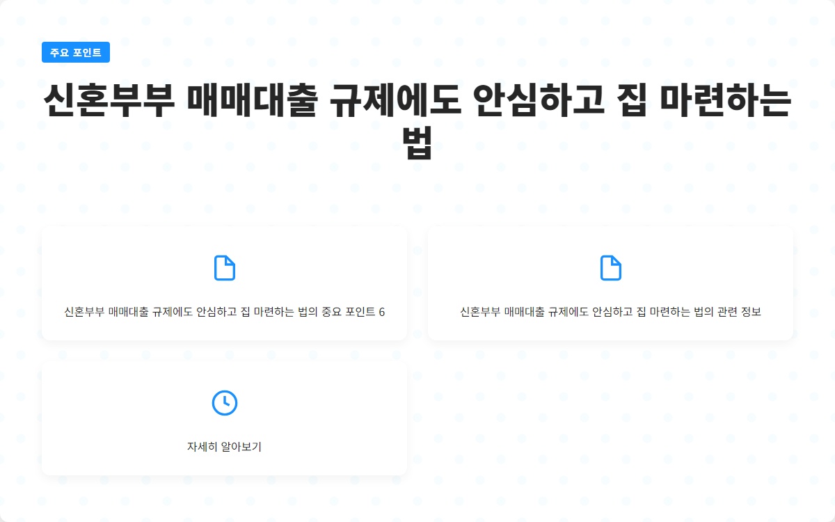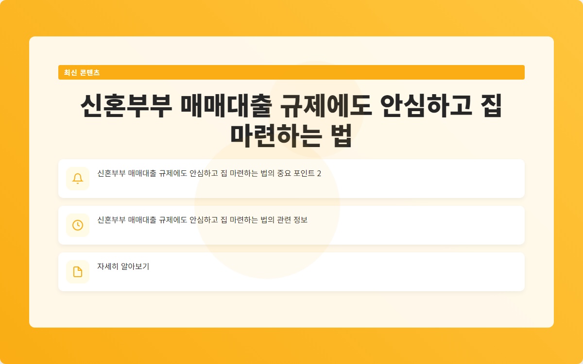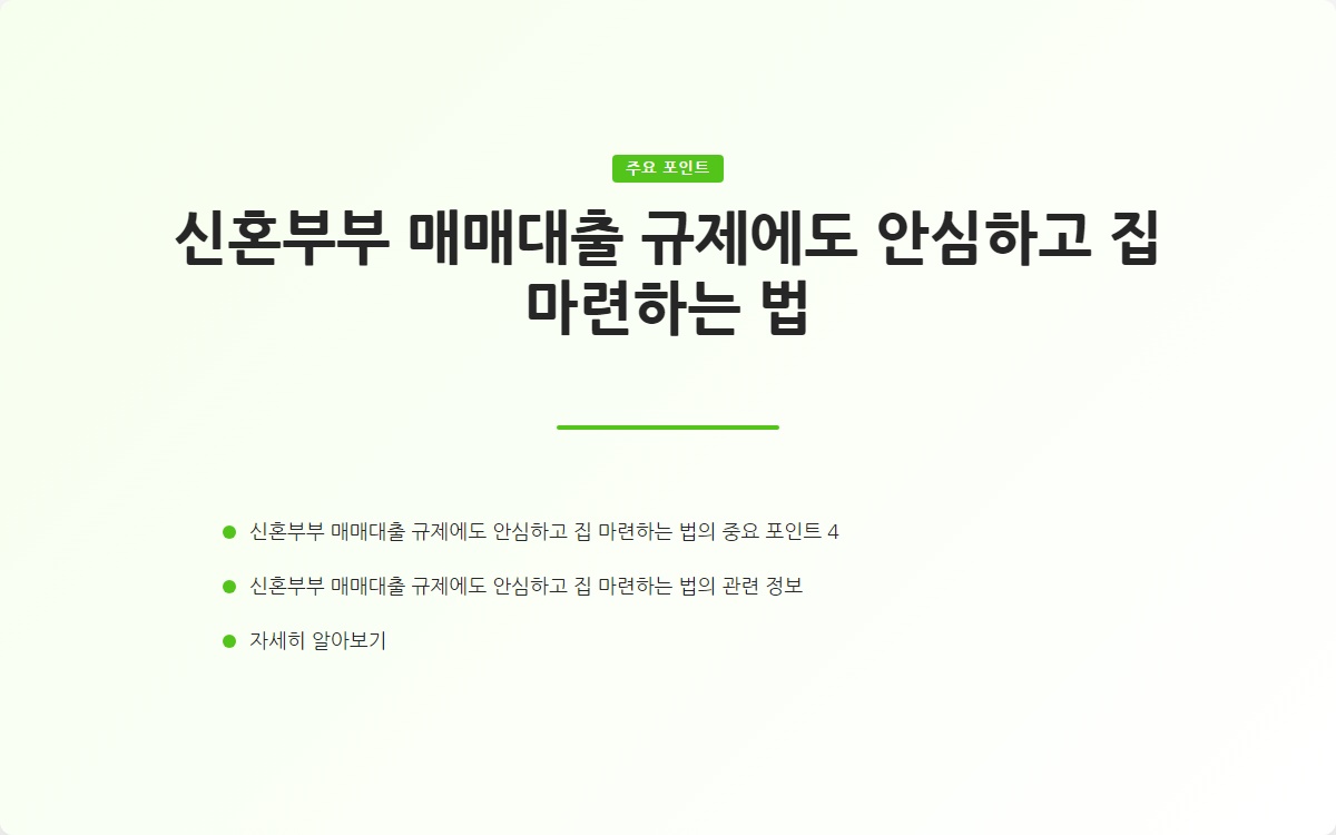 바야흐로 신혼집 마련을 고민하는 시점에 많은 신혼부부들이 대출 규제와 복잡한 절차에 겁을 먹곤 합니다. 하지만 이러한 규제 속에서도 집을 마련할 수 있는 방법이 있습니다. 여러분은 집 마련에 대해 얼마나 고민하고 계신가요? 이 글을 통해 신혼부부들이 매매대출을 통해 안심하고 집을 마련하는 방법을 알아보겠습니다.