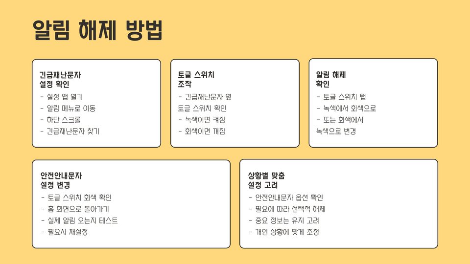 이 간단한 절차를 통해 더 이상 재난문자 알림을 받을 필요가 없습니다. 그러나 주의할 점은 이 설정을 변경함으로써 중요한 재난 정보도 놓칠 수 있다는 것입니다. 안전이 최우선이라는 점을 항상 기억하세요!