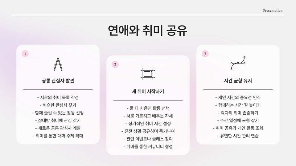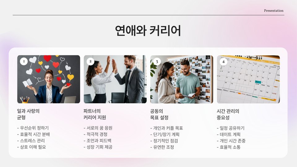 마지막으로, 서로의 성장을 도와주는 것이 성공적인 연애의 비결이 될 수 있습니다. 각자에게 목표가 있다면 그 목표를 향해 함께 나아가는 것이 중요합니다. 서로의 꿈을 응원하고 지지하는 관계는 더욱 단단해집니다.