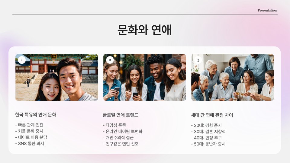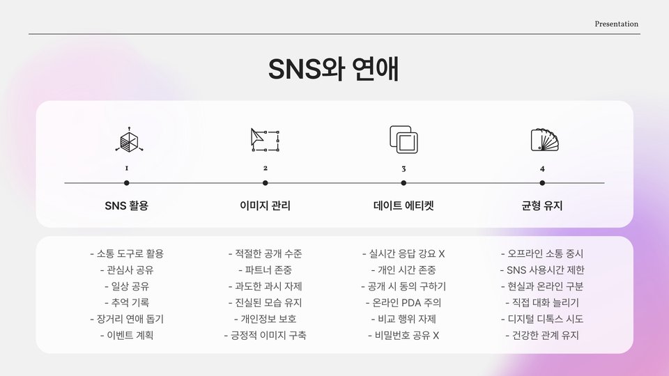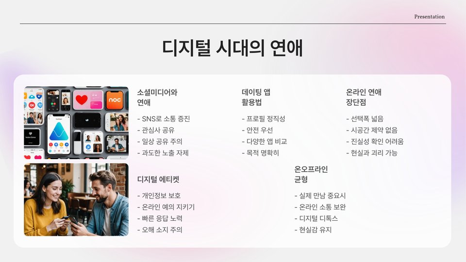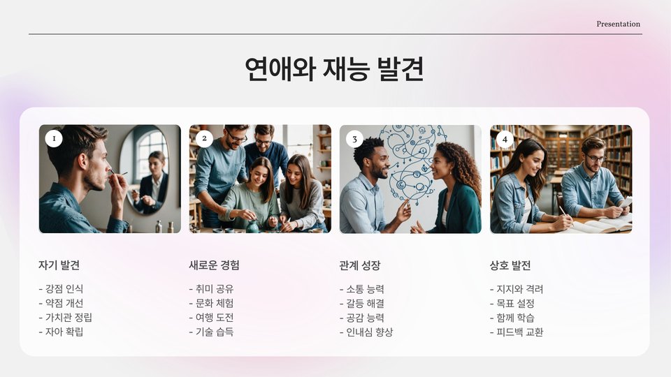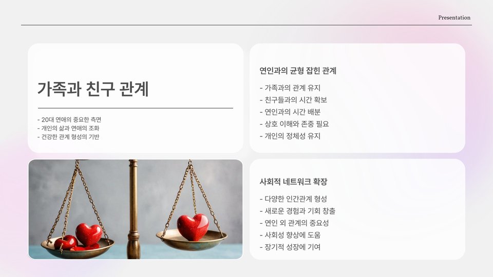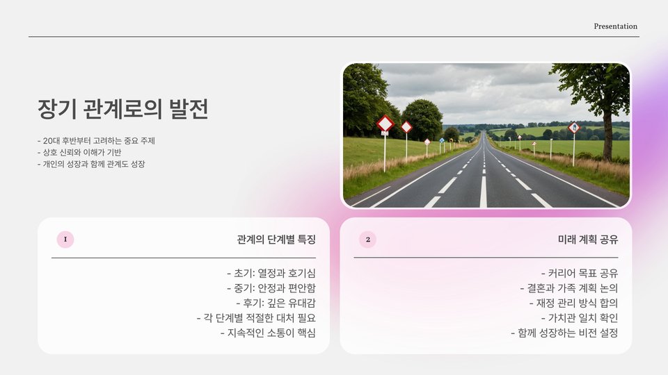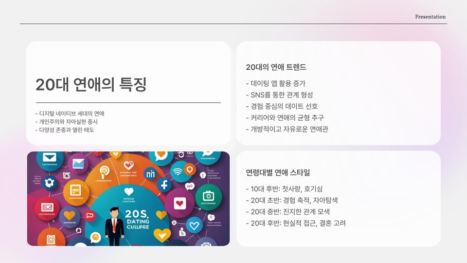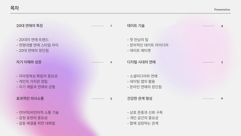 20대 연애에서는 서로의 관계가 어떻게 성장해 나가는가도 중요한 주제입니다. 연애 초기에는 서로를 알아가는 시간을 가지지만, 시간이 지날수록 더 깊이 있는 관계로 발전해야 합니다. 즉, 사랑이 단순한 감정에서 더 깊은 신뢰와 이해로 이어져야 한다는 것입니다.