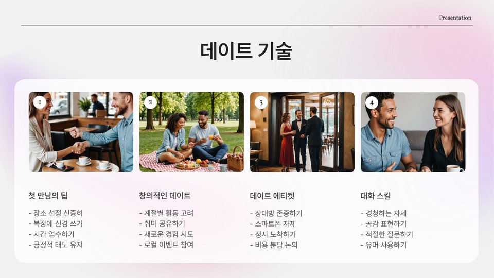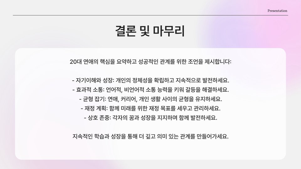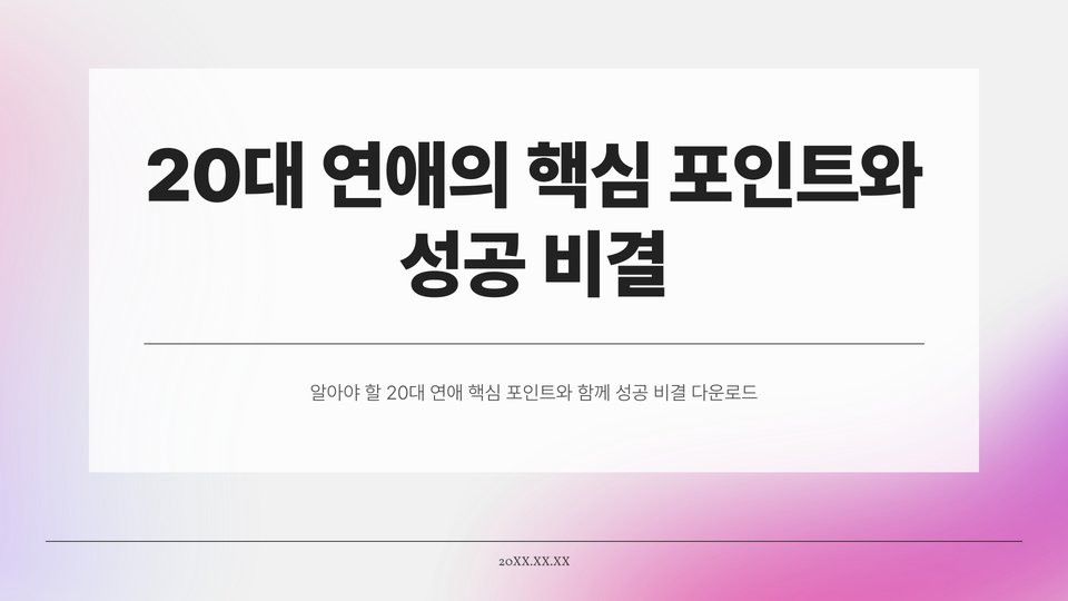 20대 연애는 여러모로 도전적이지만, 그만큼 소중한 경험을 제공합니다. 소통과 이해를 바탕으로 한 건강한 관계를 유지한다면, 여러분은 더 깊고 의미 있는 사랑을 경험할 수 있을 것입니다. 이 글에서 소개한 핵심 포인트를 통해 여러분의 연애가 더욱 풍성해지기를 바랍니다.