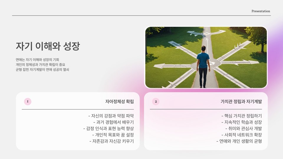 연애는 스스로를 찾는 여정입니다. 20대에 접어들면 다양한 경험을 통해 자아를 발견하고 자신의 감정을 이해하게 됩니다. 이는 연애에서도 중요한 역할을 합니다. 자신을 알지 못하면 상대방과의 관계에서 혼란을 겪을 수 있기 때문입니다.