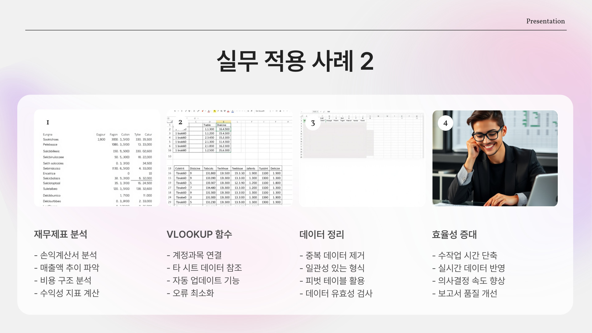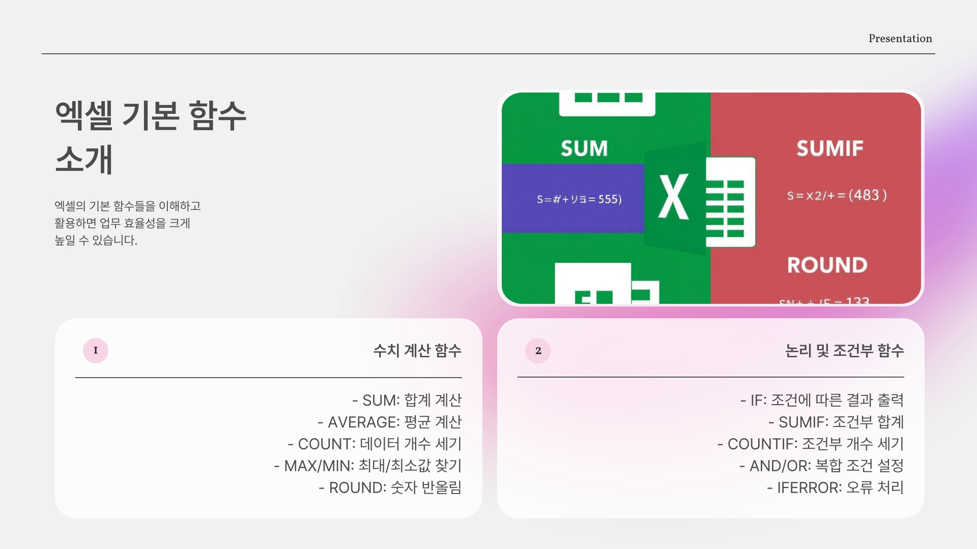 - SUM, AVERAGE, IF와 같은 함수는 업무 효율성을 높입니다.