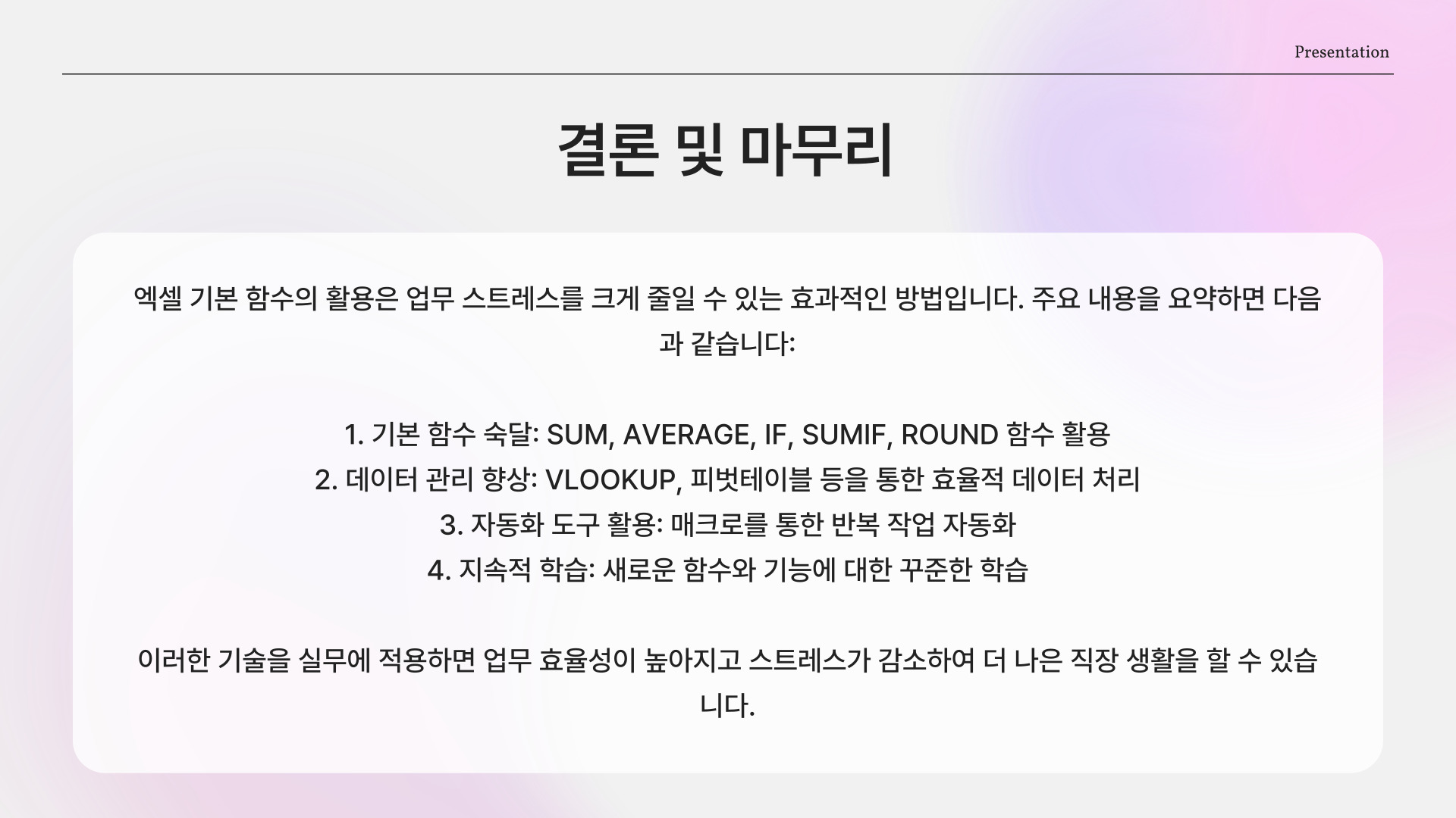 엑셀은 단순한 스프레드시트 프로그램이 아닙니다. 효율적인 데이터 관리와 분석을 통해 우리가 원하는 결과를 도출해 낼 수 있는 강력한 도구입니다. 따라서, 엑셀 기본 함수를 마스터하여 일상적인 스트레스를 줄이고, 더 나은 결과를 만들어가길 바랍니다.