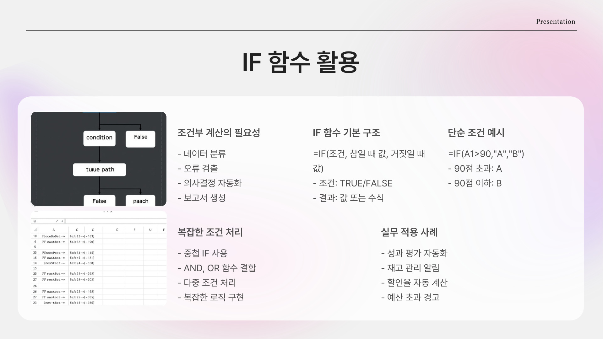또한, IF 함수는 조건에 따라 다른 결과를 반환하는 데 사용됩니다. 예를 들어, =IF(C1>100, "합격", "불합격")은 C1의 값이 100보다 크면 "합격"을, 그렇지 않으면 "불합격"을 표시합니다. 이러한 조건문은 데이터 분석의 유연성을 높여줍니다.