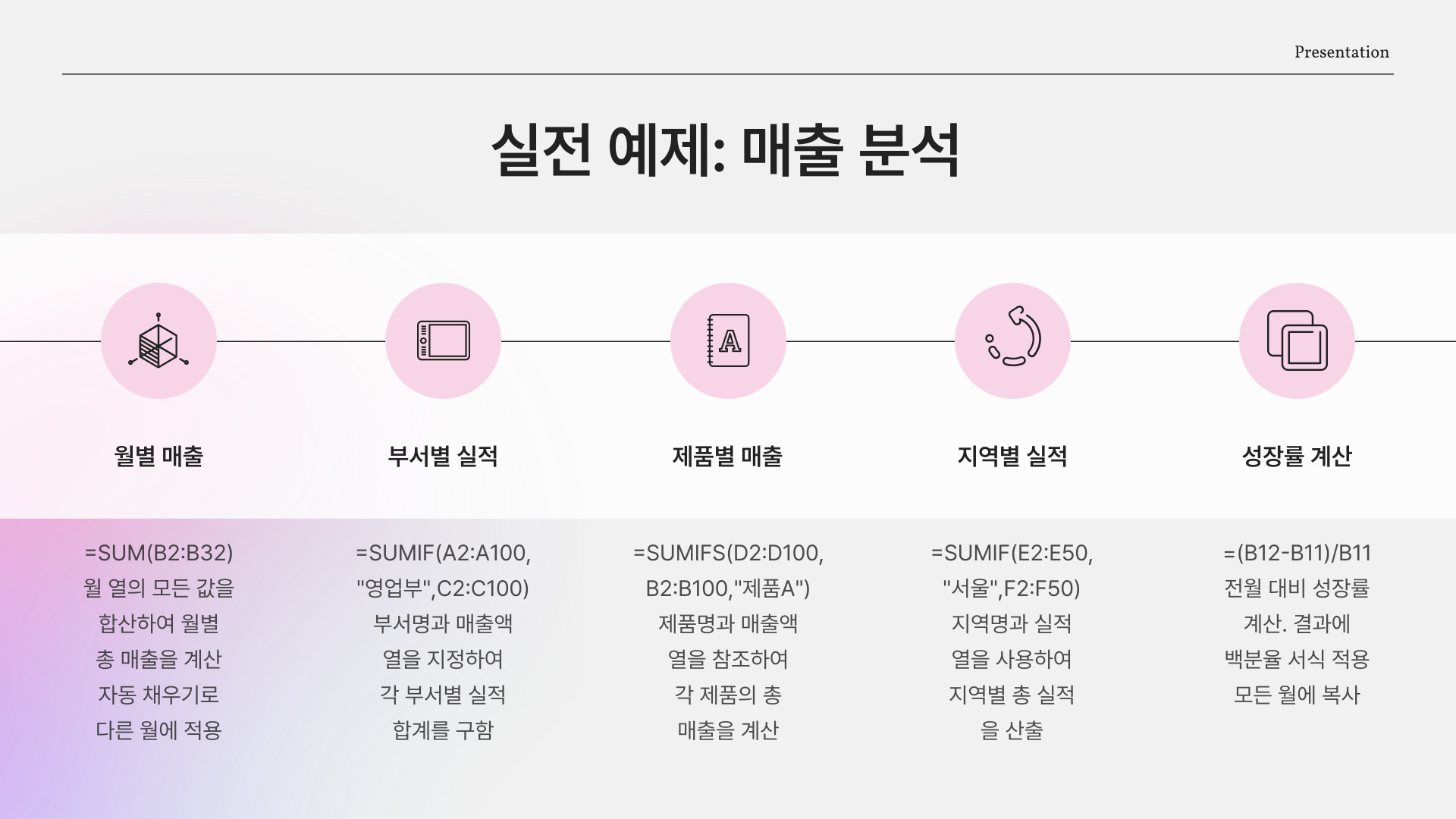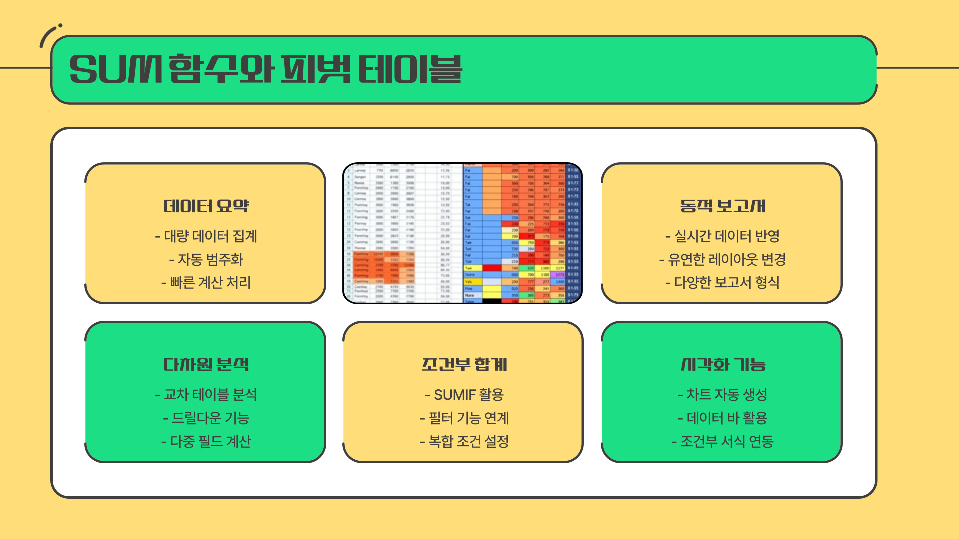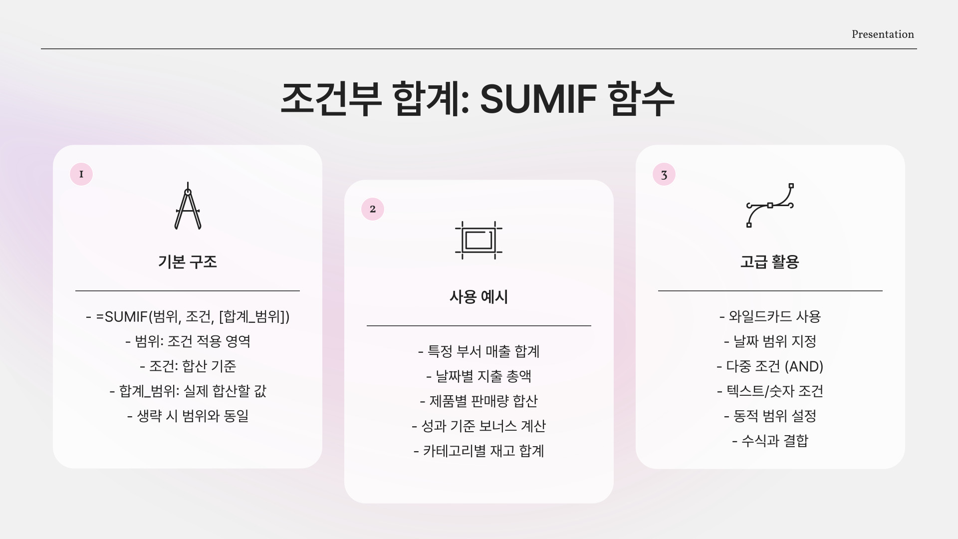 | 조건부 합계(SUMIF) | 특정 조건에 맞는 값만 합산 |