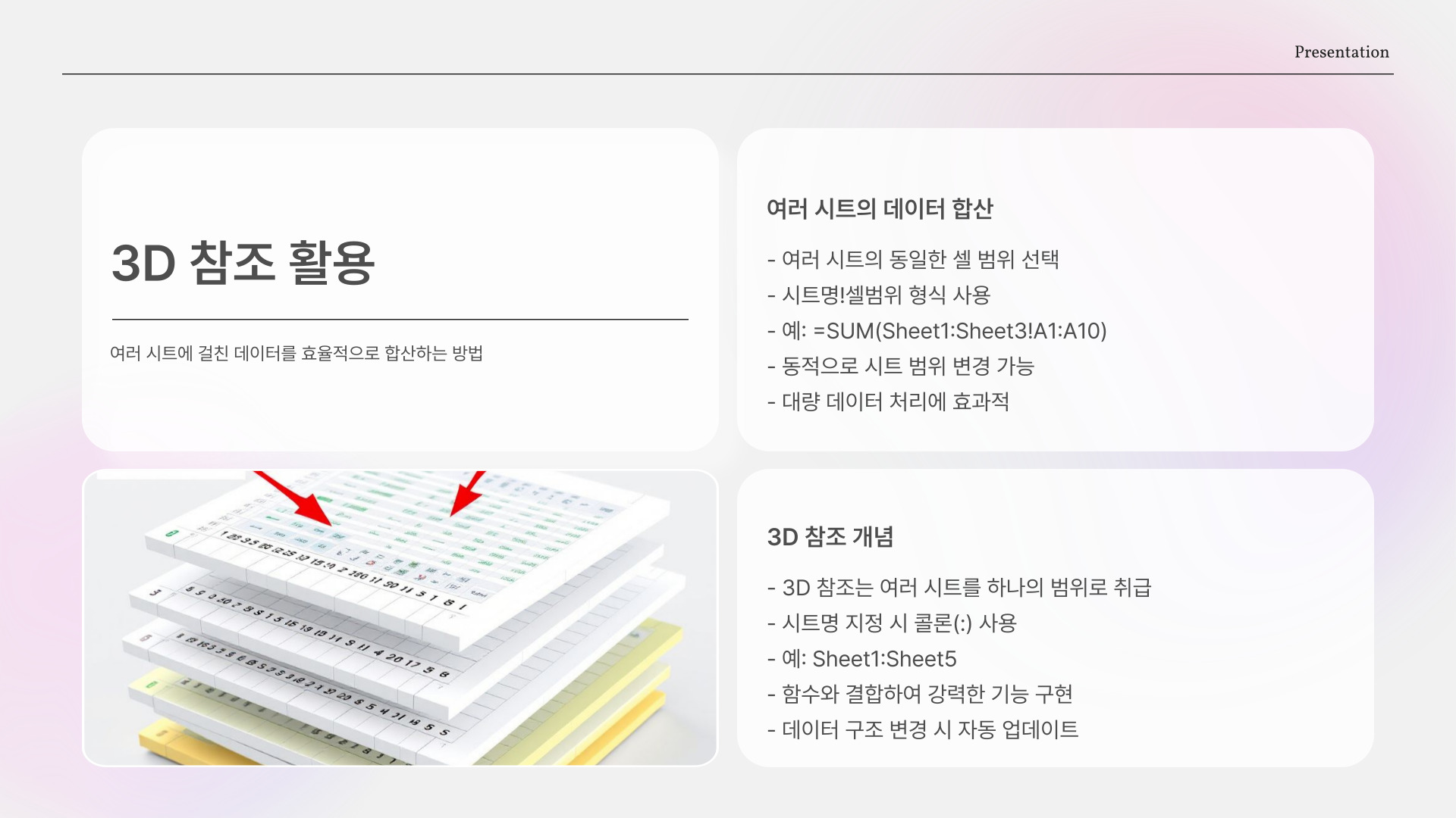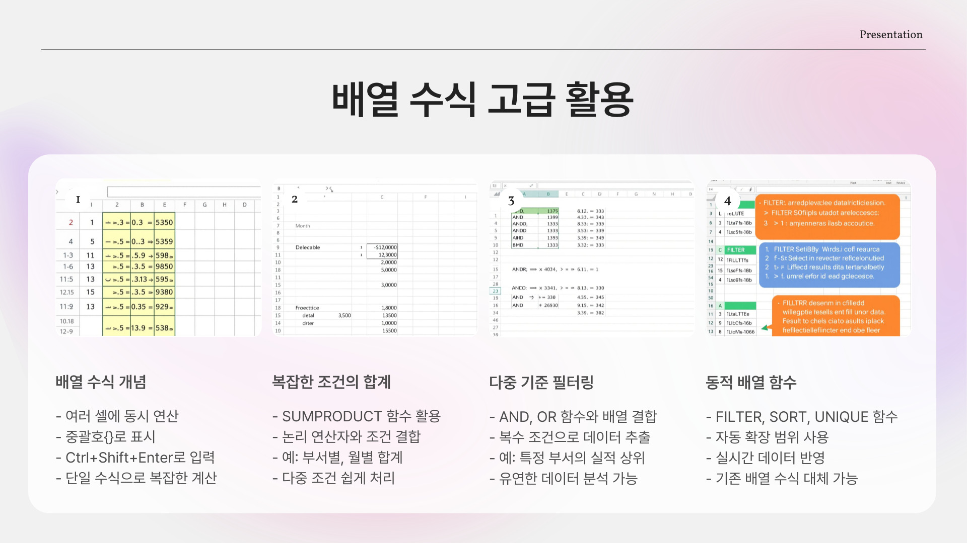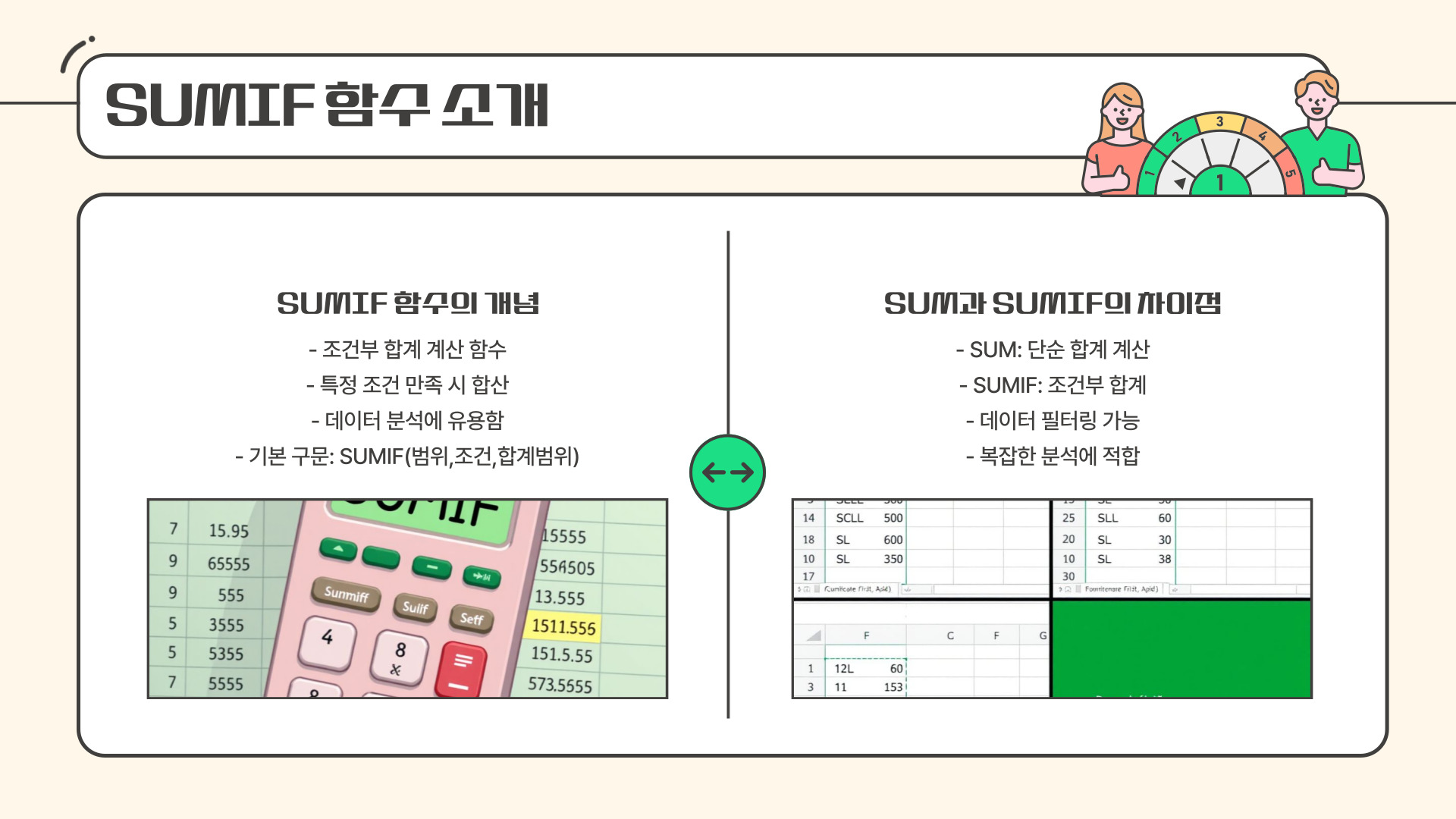 | 조건부 합계(SUMIF) | 특정 조건에 맞는 값만 합산 |