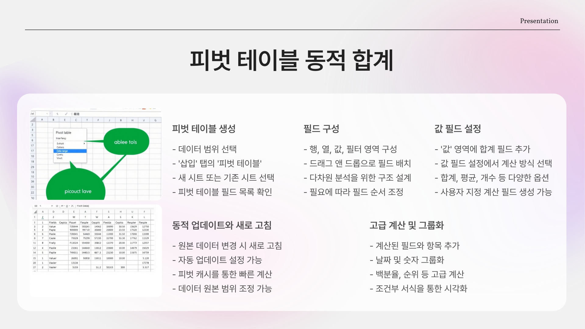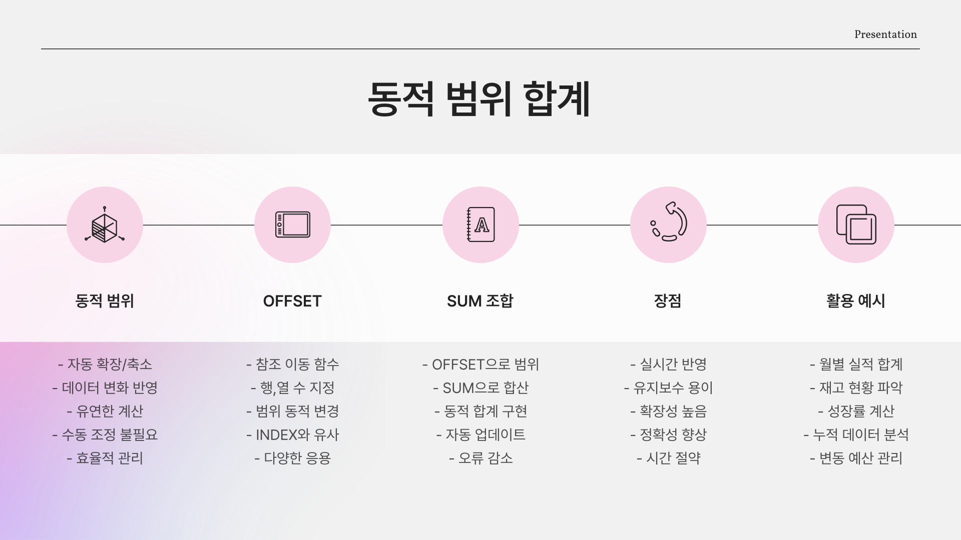 | 자동 합계 | 선택한 범위의 합계를 자동으로 계산 |