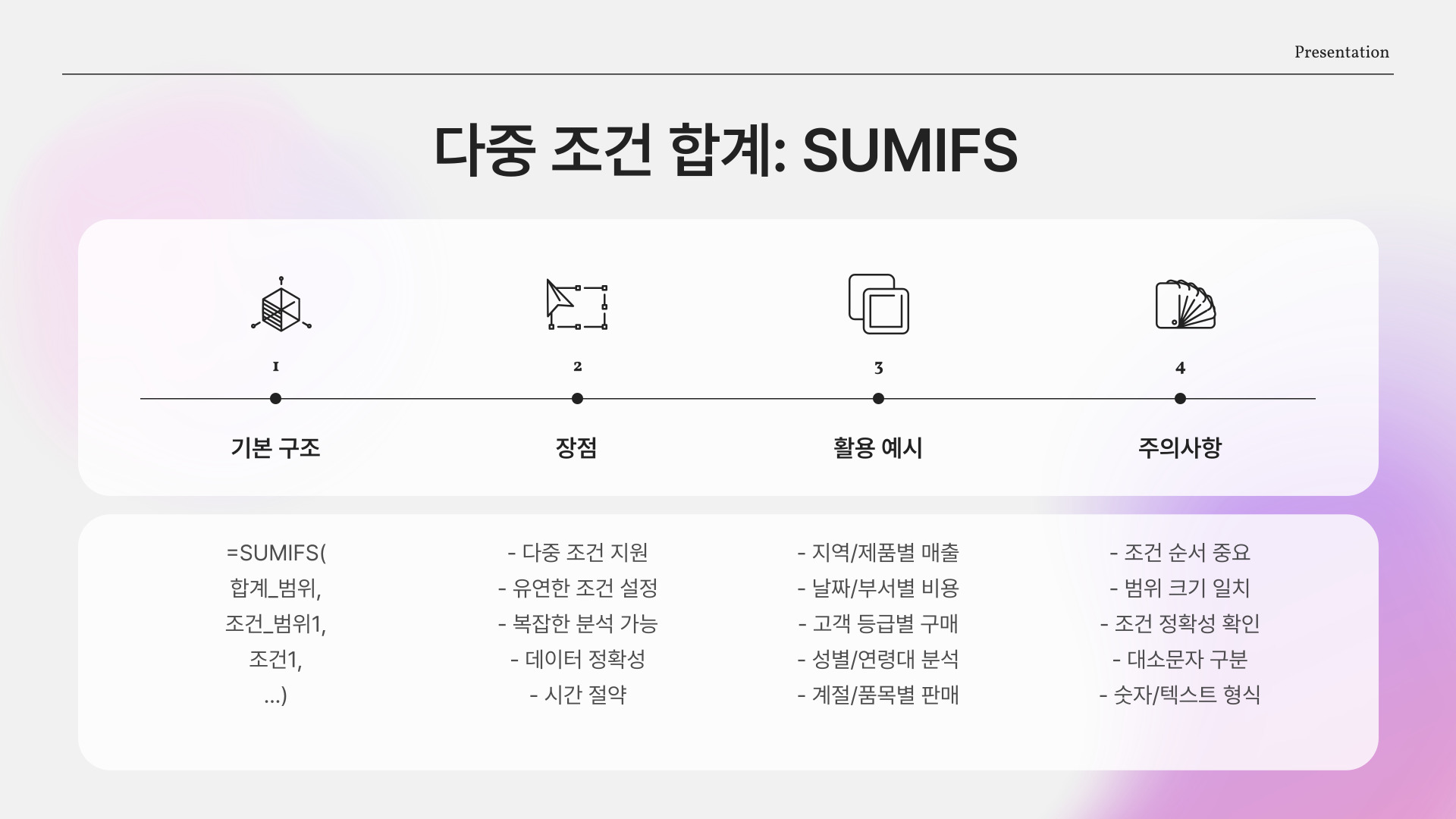 엑셀의 조건부 합계 기능인 SUMIFSUMIFS를 통해 특정 조건에 맞는 데이터만 선택적으로 합산할 수 있습니다. 예를 들어, 특정 제품의 매출만 합산하고 싶다면 =SUMIF(범위, 조건, 합계_범위)와 같은 수식을 사용할 수 있습니다. 이 기능을 활용하면 데이터 분석의 정확성을 높이고, 필요한 정보를 빠르게 확인할 수 있습니다.