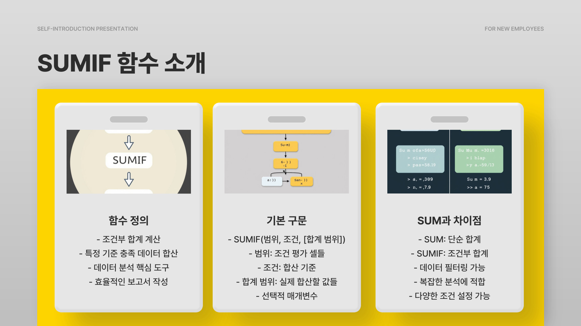 SUMIF 함수는 특정 조건을 만족하는 셀들의 합계를 계산하는 함수입니다. 예를 들어, 판매 데이터에서 특정 제품의 판매량 합계를 구하고 싶을 때 유용합니다. 기본 구문은 SUMIF(범위, 조건, [합계 범위])로 구성됩니다. 여기서 범위는 조건을 확인할 셀들의 집합, 조건은 어떤 기준으로 합계를 계산할지를 나타내며, 합계 범위는 실제로 합계를 구할 셀들을 지정합니다.