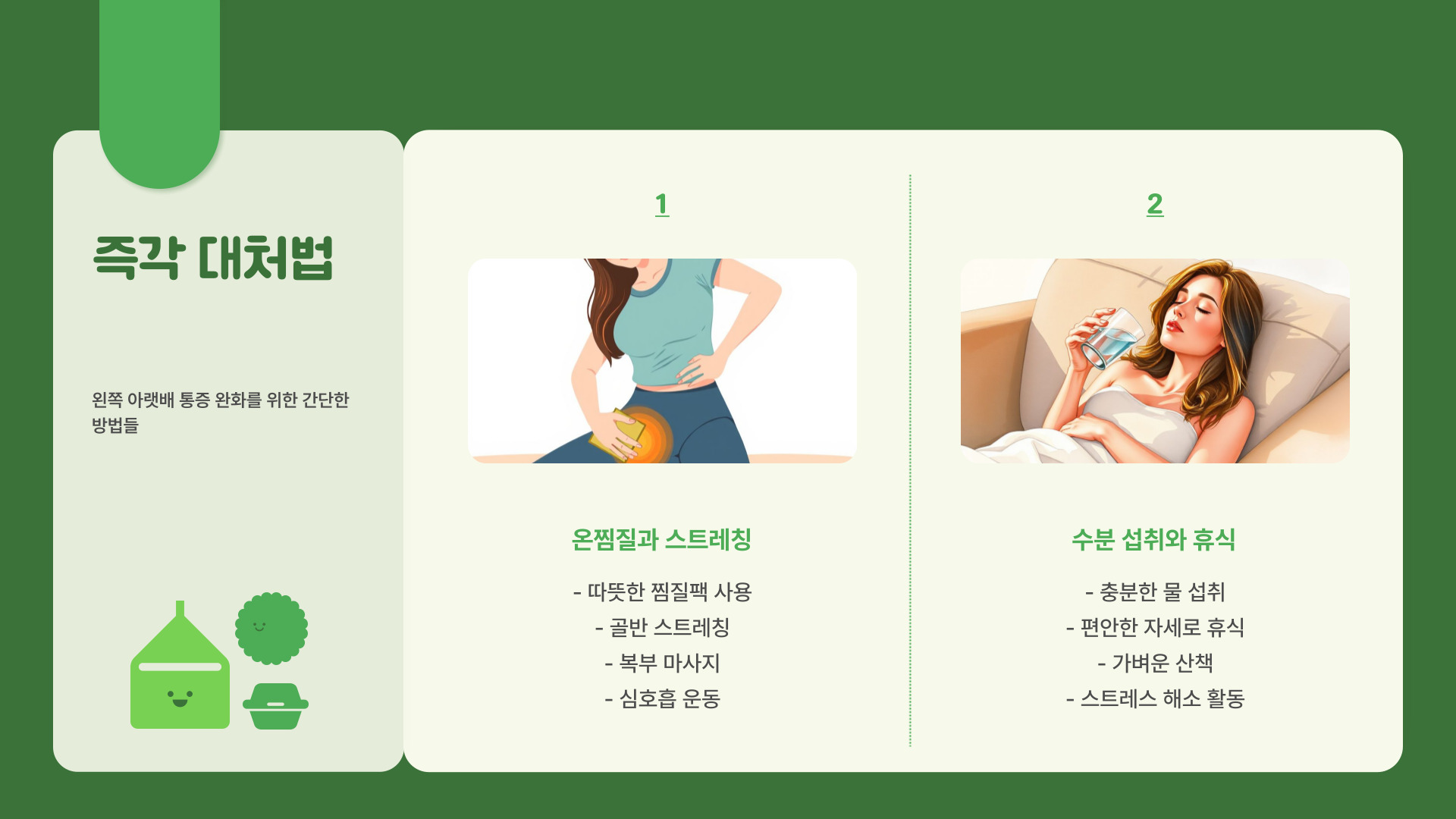 여자 왼쪽 아랫배 통증이 발생했을 때, 몇 가지 간단한 대처 방법을 통해 완화할 수 있습니다. 첫 번째로, 따뜻한 찜질을 통해 통증을 완화할 수 있습니다. 또한, 편안한 자세로 휴식을 취하는 것도 도움이 됩니다. 필요할 경우, 의사의 처방에 따라 진통제를 복용할 수도 있습니다. 그러나 이러한 대처법은 일시적인 해결책일 뿐, 원인에 대한 정확한 진단과 치료가 필수적입니다.