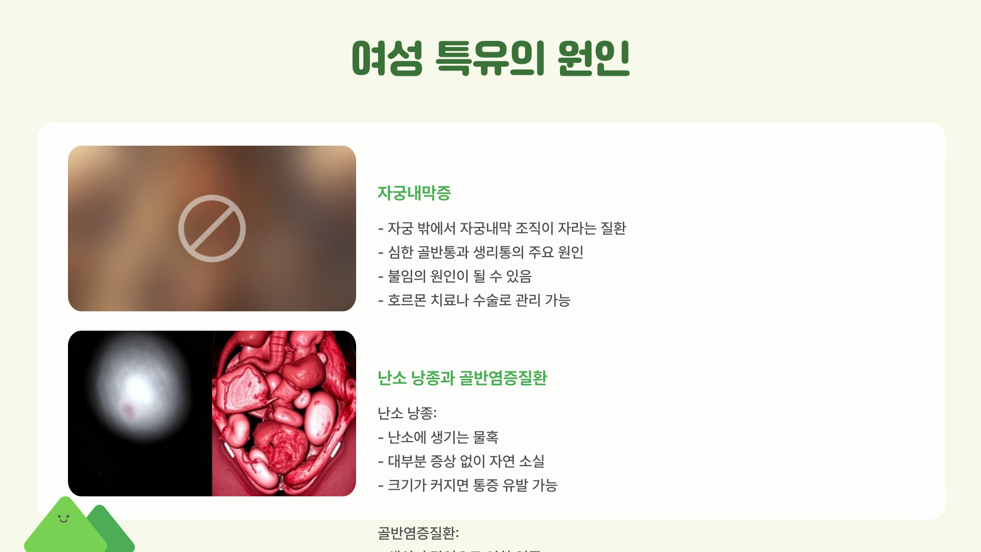 - 생리통, 과일증후군, 소화불량 등이 흔한 원인이다.
