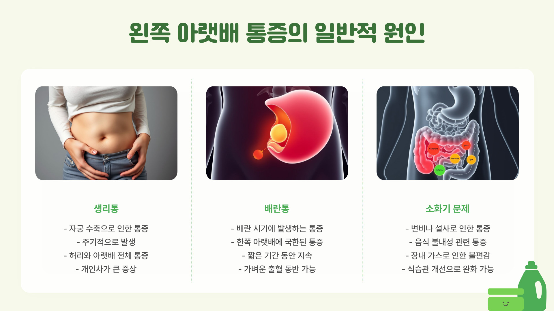 왼쪽 아랫배의 통증은 다양한 원인에 의해 발생할 수 있으며, 그 중 가장 흔한 원인으로는 생리통, 과일증후군, 소화불량 등이 있습니다. 이러한 각 원인은 통증의 양상과 강도를 다르게 만들 수 있습니다.