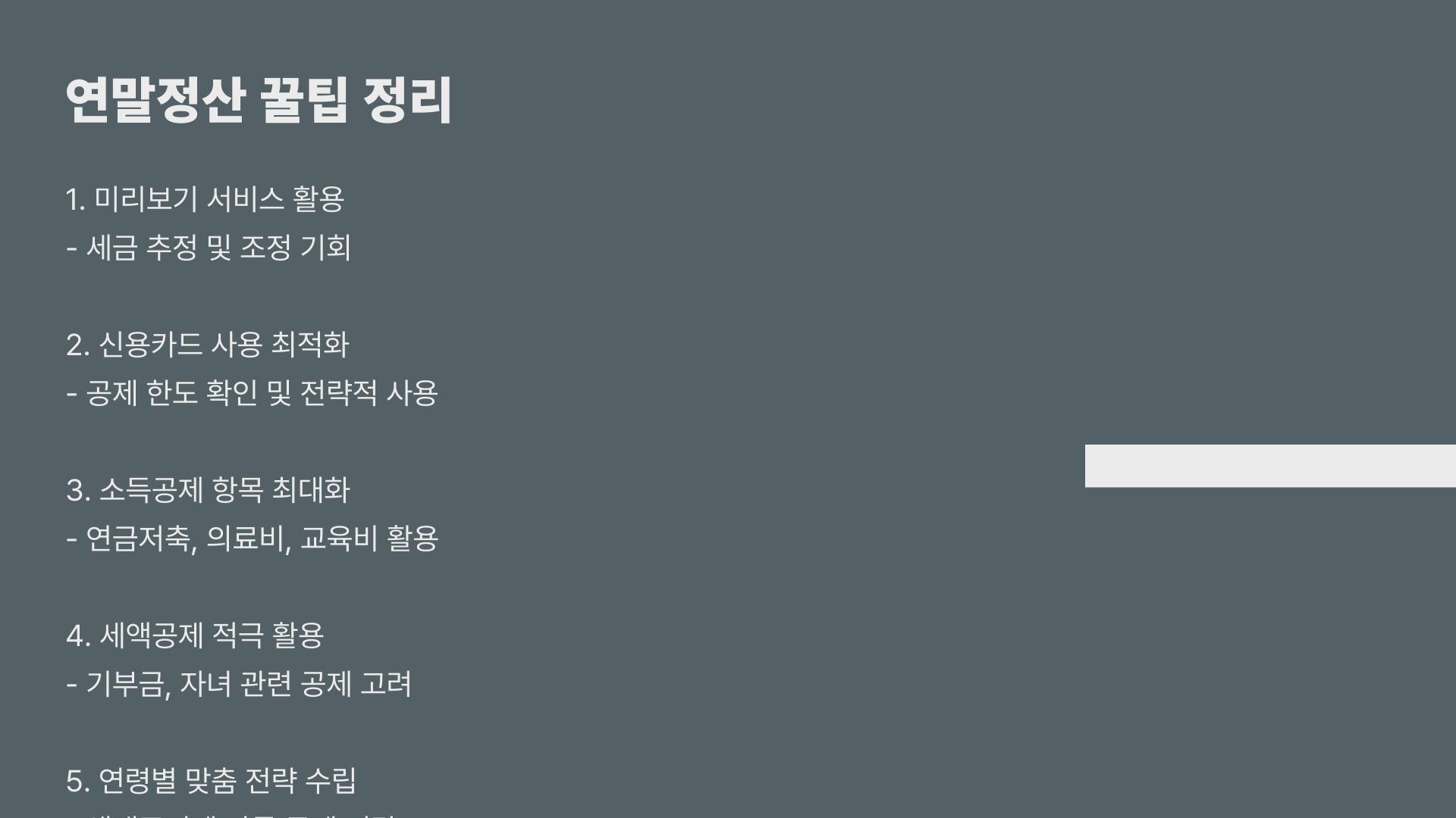 - 체크리스트를 만들어 공제 항목을 빠짐없이 챙기자.