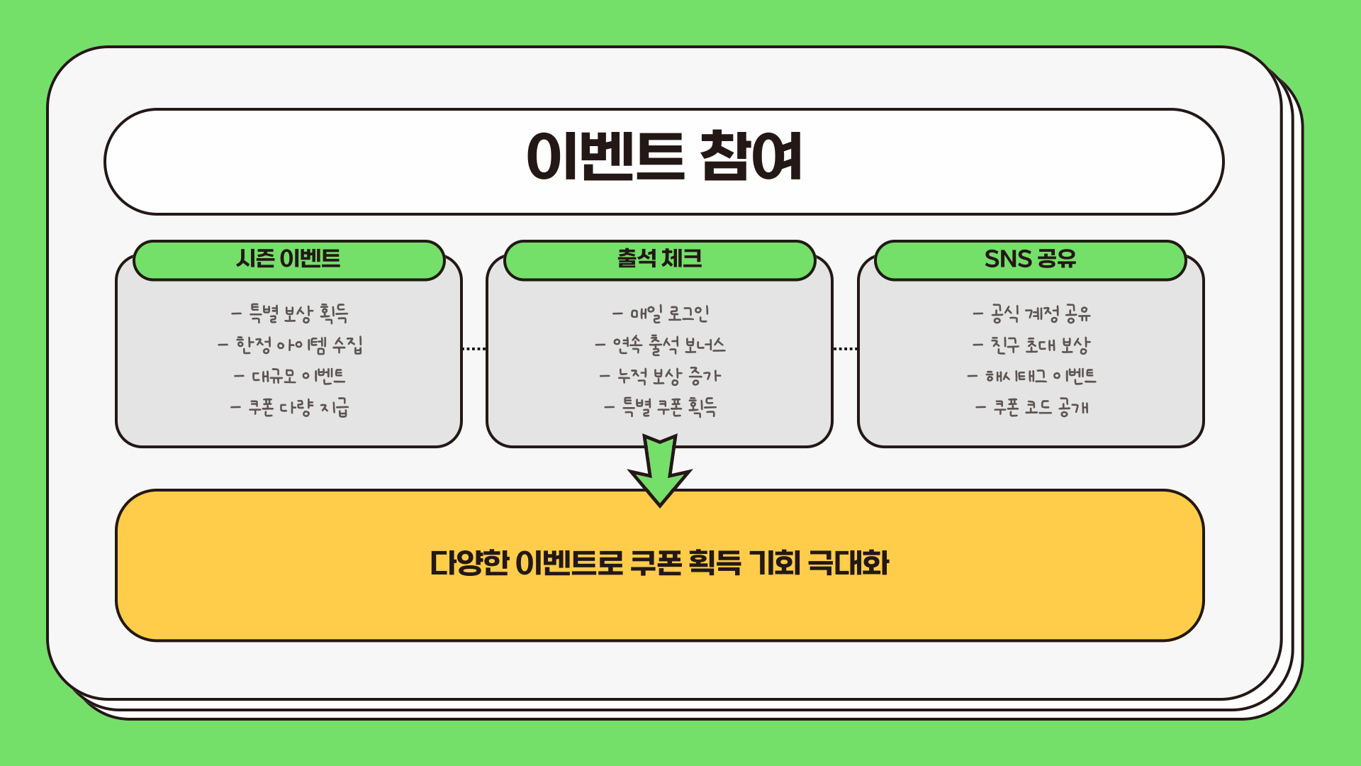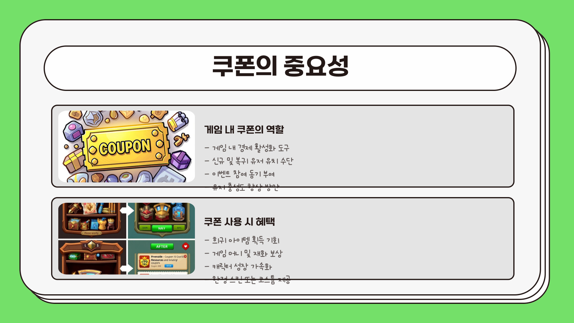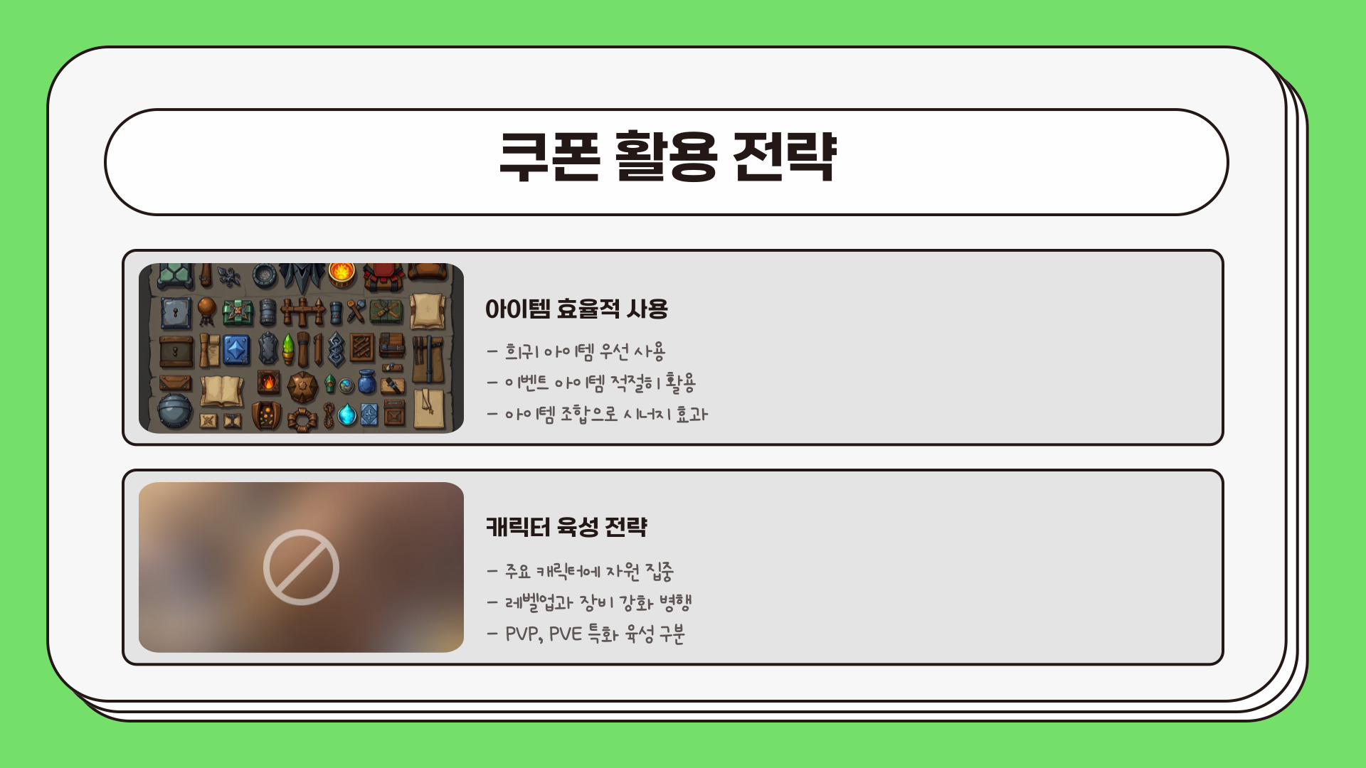 - 쿠폰은 새로운 아이템이나 보상을 제공합니다.