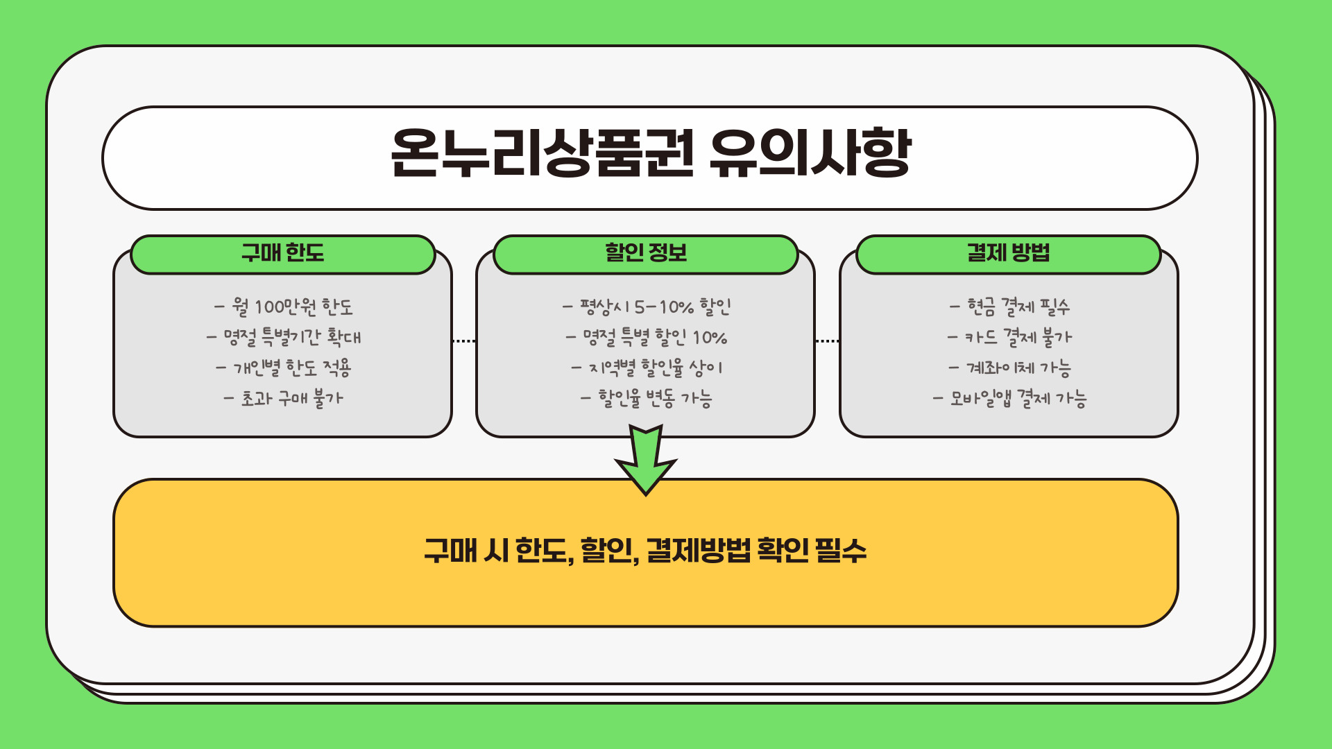 온누리상품권을 구매할 때는 몇 가지 유의사항이 있습니다. 먼저 상품권의 유효기간을 꼭 확인해야 합니다. 대개 상품권은 발급일로부터 5년간 유효하지만, 지역에 따라 다를 수 있으므로 미리 체크하는 것이 좋습니다. 유효기간이 만료된 상품권은 사용할 수 없기 때문에 대비가 필요합니다.