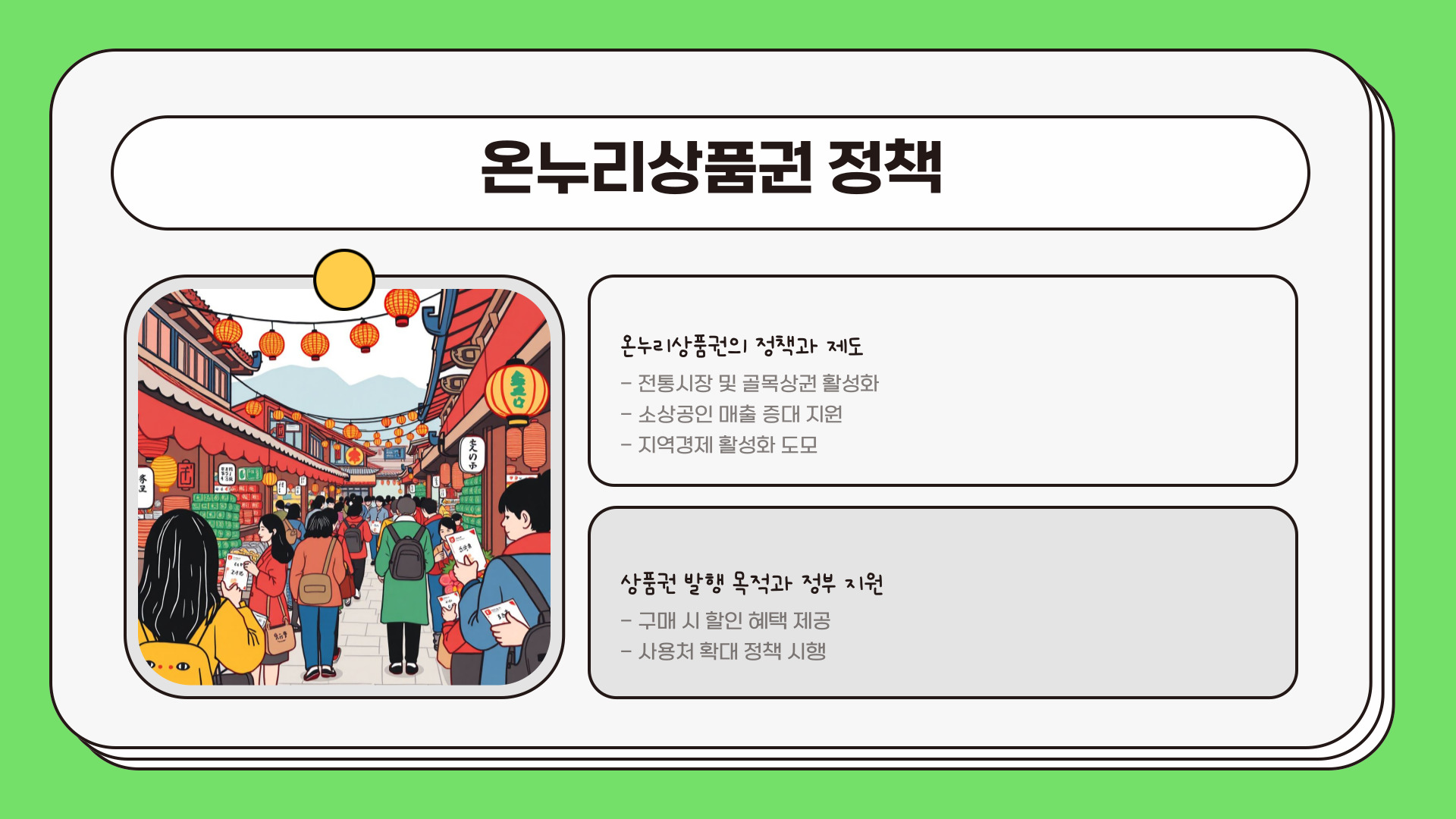 온누리상품권은 전국의 전통시장에서 사용할 수 있으며, 식료품, 의류, 가전제품 등 다양한 상품을 구매할 수 있습니다. 소상공인 지원을 위해 사용되기 때문에, 지역 경제 활성화에 기여할 수 있습니다. 특히, 지역 특산물을 구매하는 데 적합하며, 이는 관광객들에게도 좋은 경험이 됩니다. 온누리상품권을 통해 전통시장을 방문해보세요!