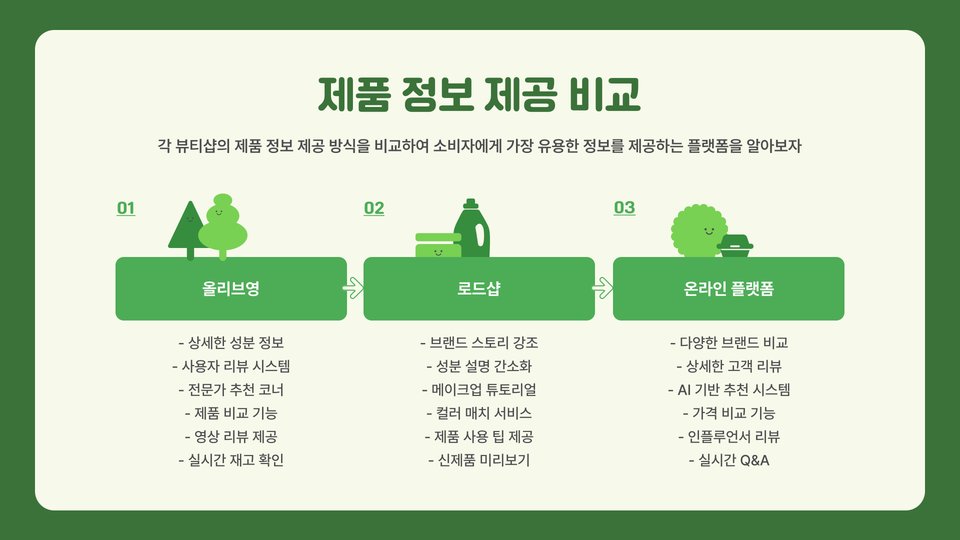 올리브영은 친절한 직원 서비스와 쾌적한 쇼핑 환경을 자랑합니다. 반면 다른 뷰티샵은 온라인 쇼핑에 강점을 가지면서도 고객 서비스에서 차별점을 두고 있습니다. 예를 들어, 뷰티쁠은 상시 1:1 상담 서비스를 제공하여 소비자들이 원하는 제품을 쉽게 찾을 수 있도록 돕습니다.