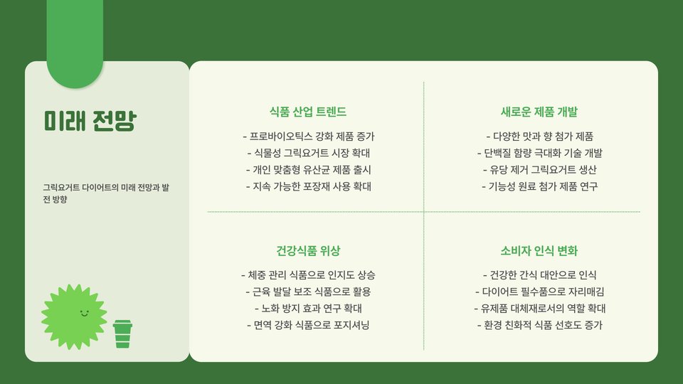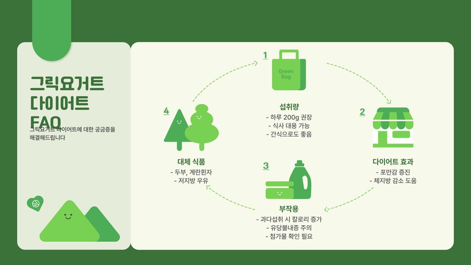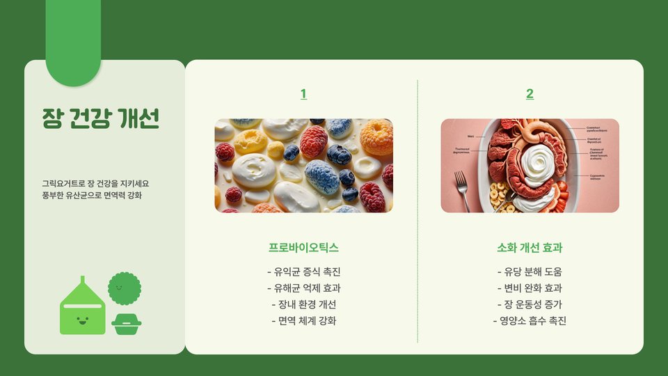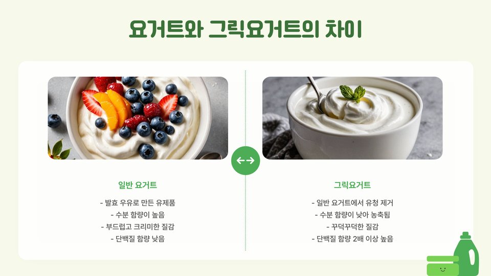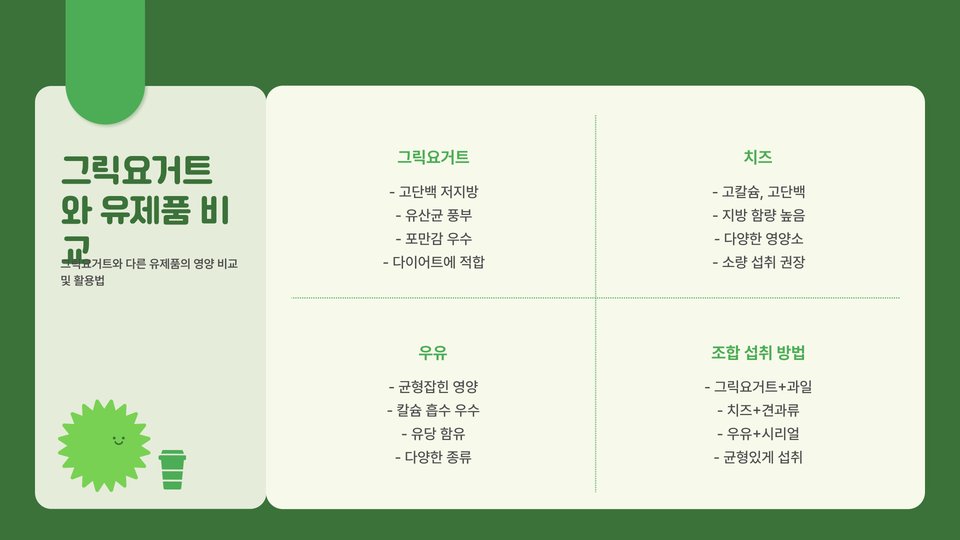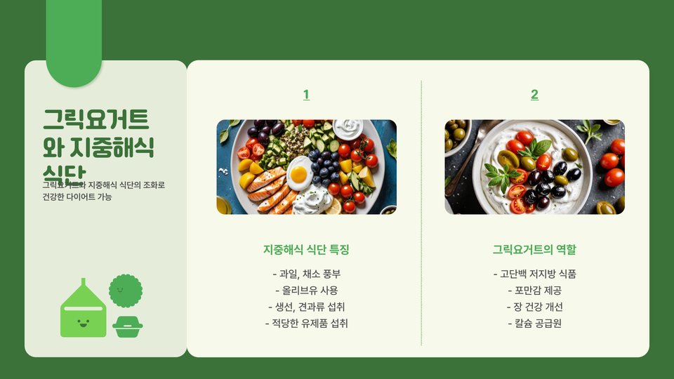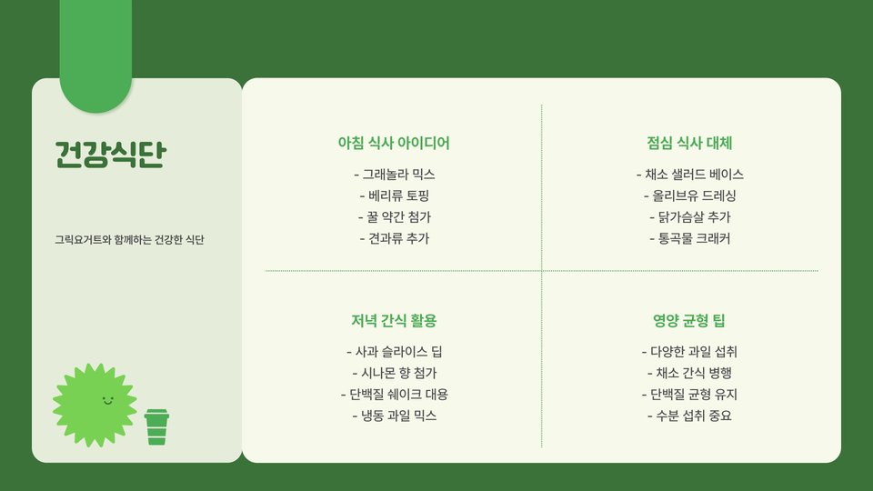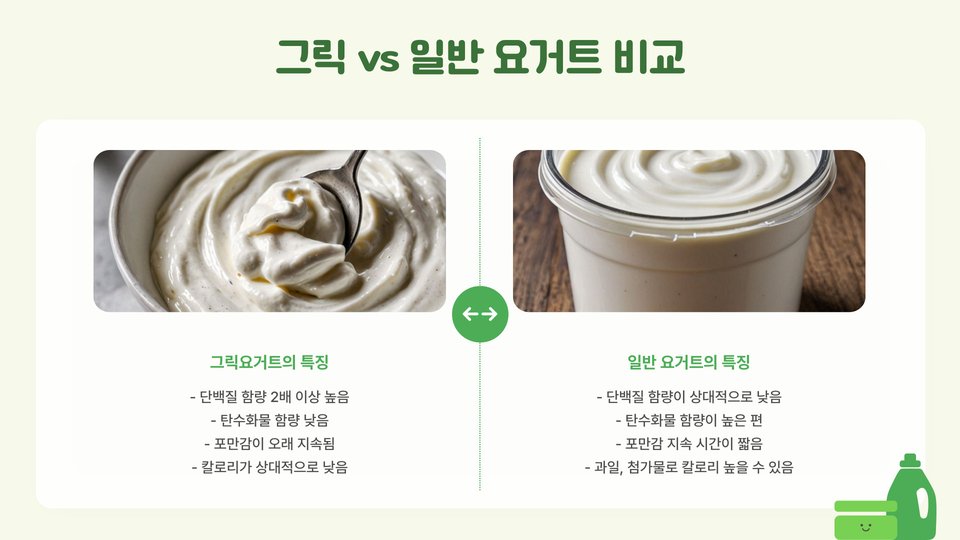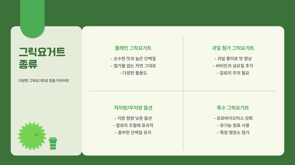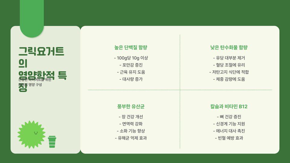 - 그릭 요거트는 단백질이 풍부하여 포만감을 오래 유지.
