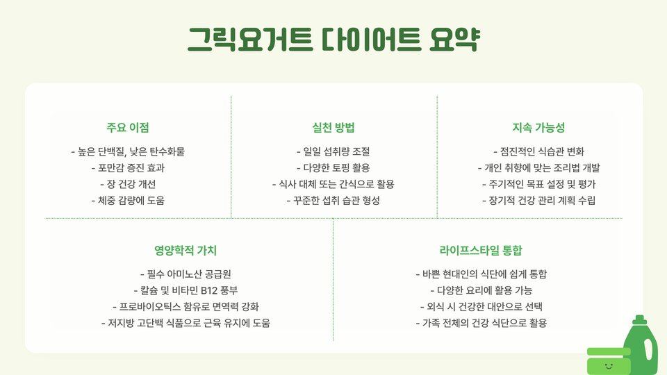 마지막으로, 그릭 요거트는 풍부한 칼슘과 비타민을 제공하여 뼈 건강에도 이롭습니다. 특히, 여성의 경우 골다공증 예방을 위해 칼슘 섭취가 중요한데, 그릭 요거트가 이를 돕습니다. 이러한 다양한 이점은 그릭 요거트를 통한 다이어트의 매력적인 부분입니다.