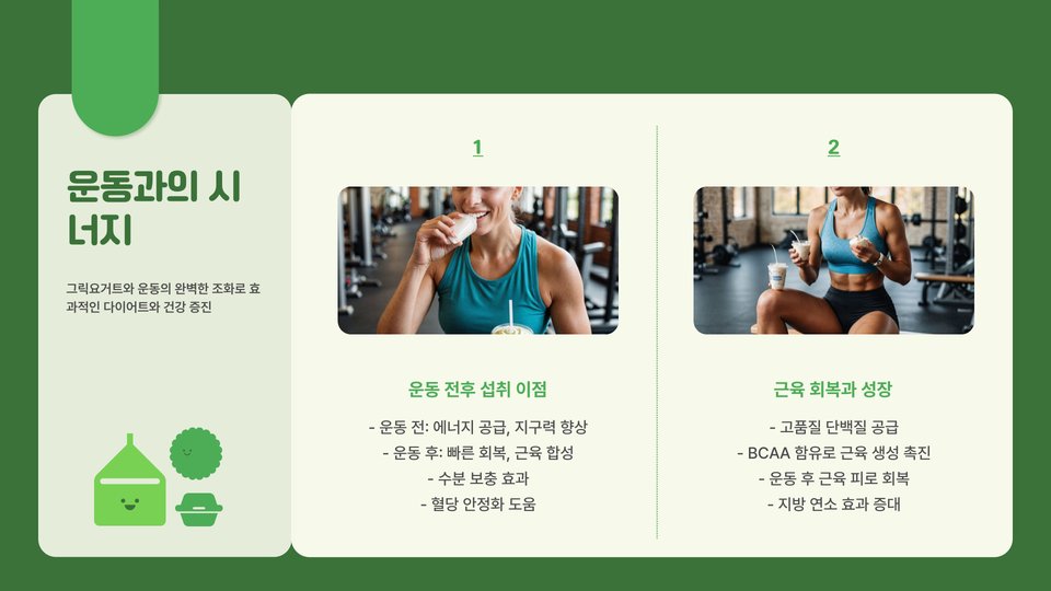 그릭요거트는 다른 요거트에 비해 여러 가지 장점이 있습니다. 첫째, 그릭요거트는 단백질 함량이 높아 다이어트 시에 필요한 포만감을 제공합니다. 이로 인해 간식이나 추가 식사를 줄일 수 있어 체중 관리에 효과적입니다. 둘째, 그릭요거트는 일반 요거트보다 수분 함량이 적어 더욱 농축된 영양소를 제공합니다. 이는 특히 운동 후 회복에 필요한 영양소를 빠르게 공급하는 데 유리합니다.