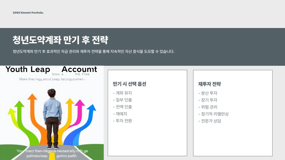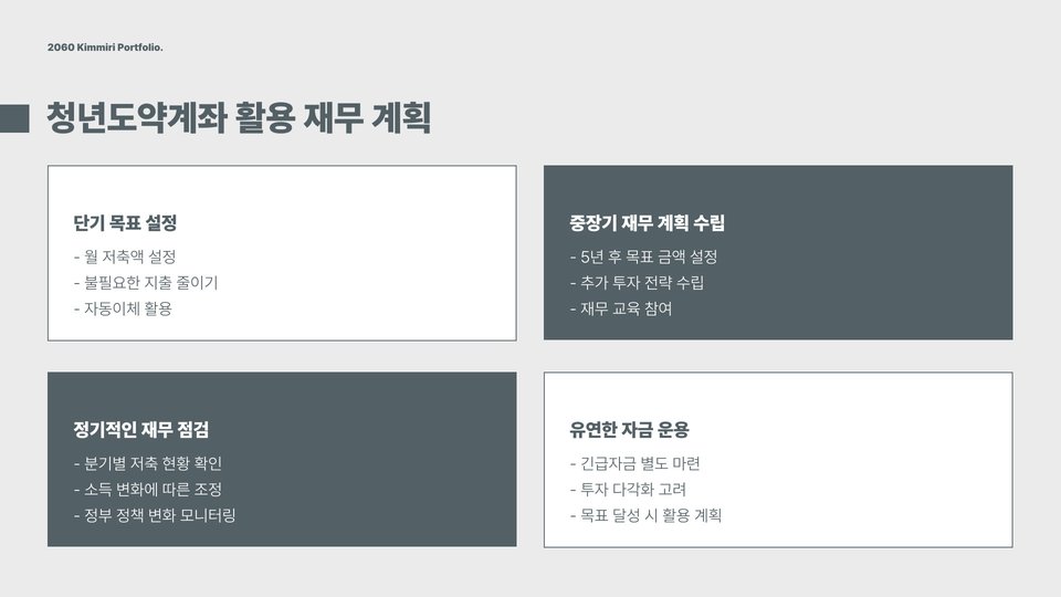 청년도약계좌는 단기적인 이익보다 장기적인 자산 형성을 목표로 해야 합니다. 따라서 장기 투자 계획을 세우고, 다양한 금융 상품을 비교 분석하는 것이 중요합니다. 예를 들어, 주식, 채권, 펀드와 같은 다양한 투자 방식을 고려하여 포트폴리오를 다각화하는 것이 좋습니다. 이를 통해 리스크를 분산하고, 더 큰 수익을 기대할 수 있습니다. 또한, 금융 시장의 변화에 민감하게 반응하여 필요 시 투자 전략을 조정하는 것도 중요합니다.