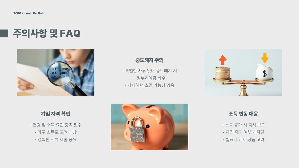 재정 계획은 단순히 저축만을 의미하는 것이 아닙니다. 종합적인 재정 관리를 통해 다른 금융 상품과의 조화로운 운용도 고려해야 합니다. 예를 들어, 전통적인 저축 계좌, 펀드 투자, 그리고 다른 투자 상품 간의 균형을 잘 맞춰야 합니다. 이를 통해 장기적 관점에서 재정적 성공을 이루는 데 도움이 됩니다.