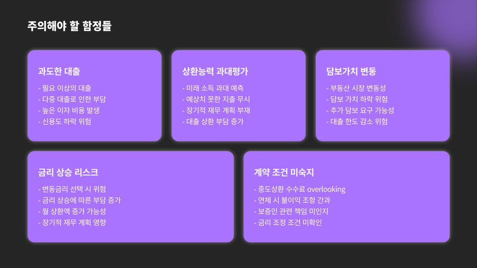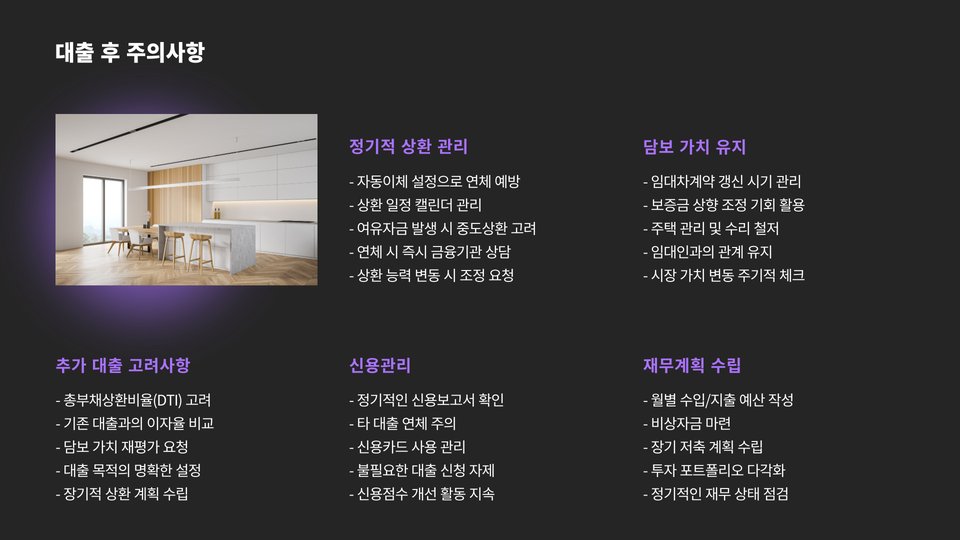 | 주의사항 | 계약서 조건 확인, 이자율 비교, 상환 계획 수립 |
