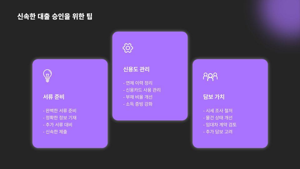 대출 신청을 신속하게 진행하기 위해서는 몇 가지 팁을 기억해 두는 것이 좋습니다. 첫째, 미리 필요한 서류를 준비하고 정리해 두세요. 둘째, 금융기관에 문의하여 대출 상품에 대한 정보를 미리 파악하는 것이 좋습니다. 마지막으로, 온라인 신청을 활용하여 시간을 절약할 수 있습니다.