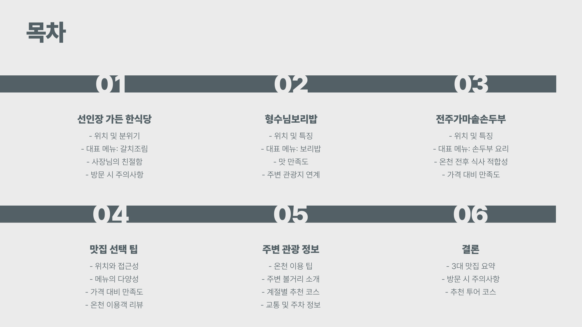 율암온천은 자연경관이 뛰어나고 온천욕으로 유명한 지역입니다. 이곳은 온천수의 효능뿐만 아니라 맛있는 음식이 있는 식당들로도 알려져 있습니다. 여행을 계획하신다면 맛집도 함께 꼭 방문해보세요. 이번 포스팅에서는 율암온천 주변의 특색 있는 맛집 세 곳을 소개하겠습니다. 이 곳들은 온천욕 후에 편안하게 식사를 즐기기에 좋은 장소입니다.
