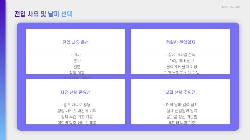 인터넷 전입신고를 진행할 때 주의할 점도 있습니다. 첫 번째는 올바른 개인 정보 입력입니다. 잘못된 정보 입력으로 인해 발생하는 오류를 방지하기 위해, 신청 전에 입력할 정보를 미리 확인하는 것이 필요합니다.