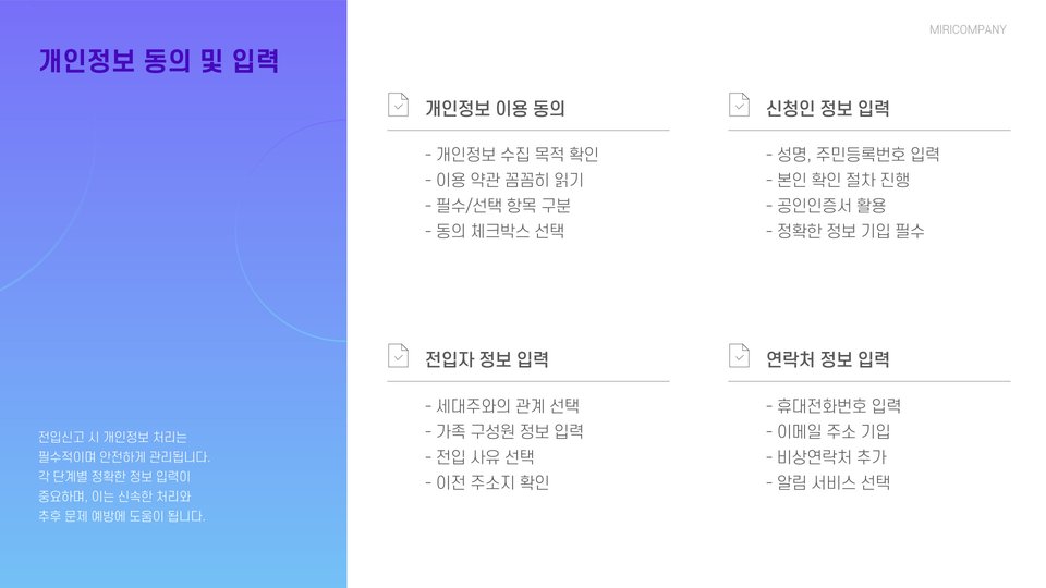 인터넷 전입신고를 진행할 때 주의할 점도 있습니다. 첫 번째는 올바른 개인 정보 입력입니다. 잘못된 정보 입력으로 인해 발생하는 오류를 방지하기 위해, 신청 전에 입력할 정보를 미리 확인하는 것이 필요합니다.