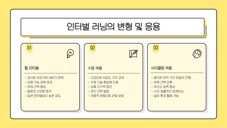 인터벌 러닝은 다양한 효과를 제공하는 강력한 운동 방식입니다. 체중 감소, 심혈관 건강 개선, 근육 증가, 시간 효율성, 그리고 정신적 집중력 향상까지 다양한 이점을 누릴 수 있습니다. 매일 바쁜 일상 속에서도 짧고 강렬한 운동으로 건강을 챙길 수 있는 방법입니다. 따라서, 인터벌 러닝을 통해 여러분의 건강 목표를 달성해 보시기 바랍니다.
