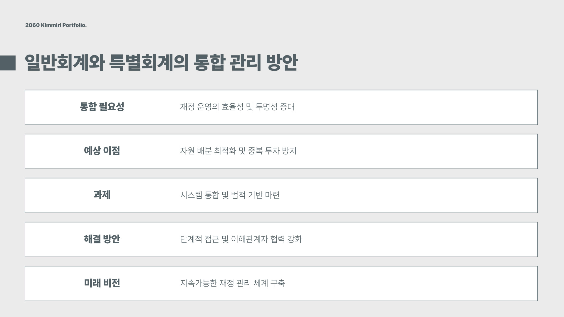 두 번째로는 데이터 기반 의사결정입니다. 효과적인 의사결정을 위해서는 실제 데이터를 기반으로 하여 정확한 분석과 예측이 이루어져야 합니다. 일반회계와 특별회계 간의 정보 교류는 의사결정 과정에 필요한 통찰력을 제공합니다. 이를 통해 정책의 효과성 및 운영 결과를 실시간으로 관리할 수 있습니다.