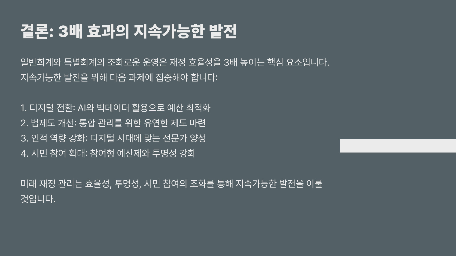 결론적으로, 일반회계와 특별회계의 조화로운 운영은 공공재정 관리의 필수 요소입니다. 이 시스템이 어떤 식으로 작동하는지를 이해하는 것은 공공 정책이나 프로그램의 효과성을 극대화하는 데 도움이 됩니다. 앞으로도 이 두 회계 시스템이 어떻게 상호 작용하며 3배의 효과를 창출하는지에 대한 연구가 필요합니다. 이러한 연구는 미래의 재정 정책 수립과 자원 관리에 큰 영향을 미칠 것입니다.