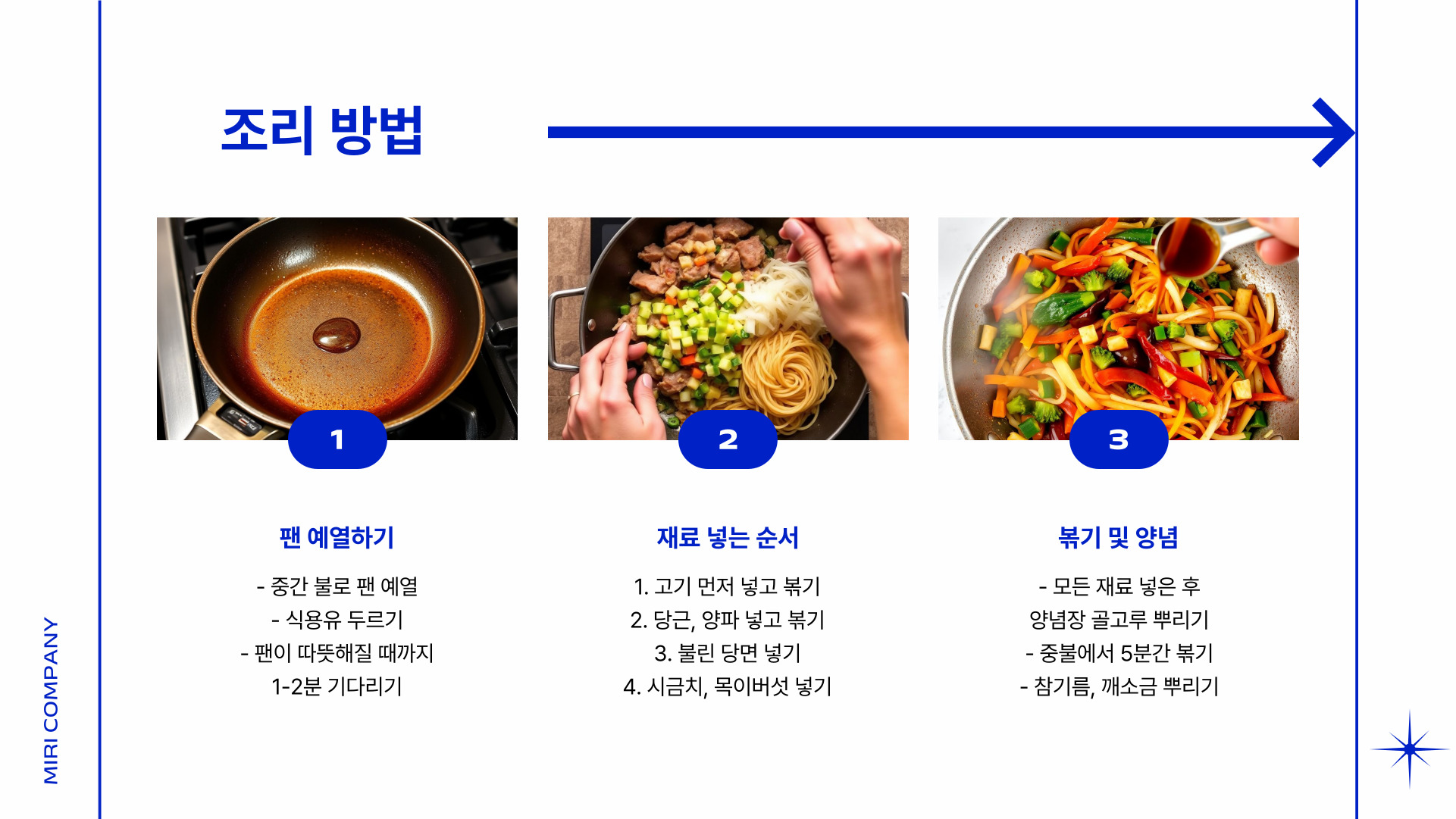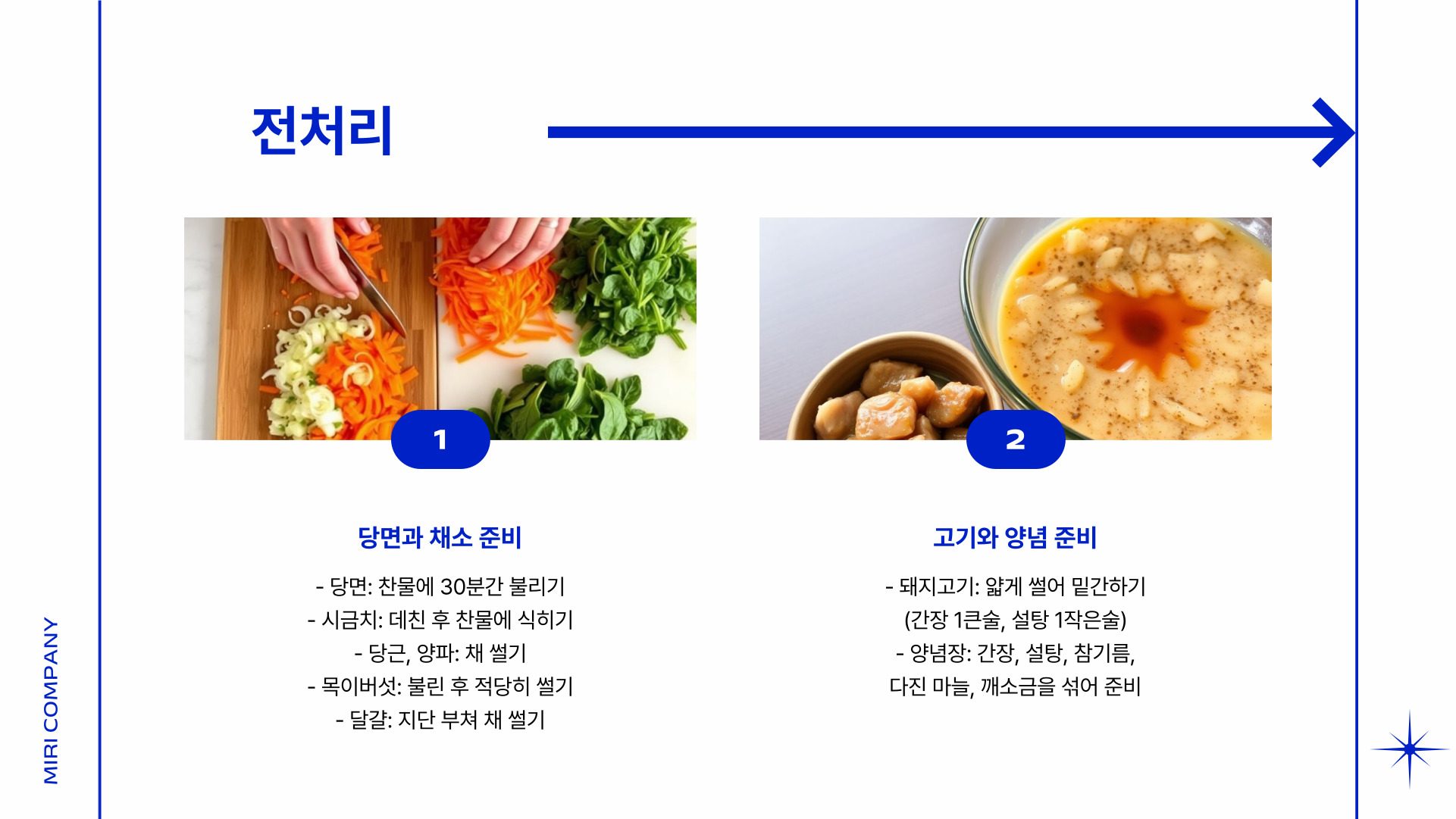 잡채를 만드는 과정은 간단합니다. 먼저, 당면은 끓는 물에 5~6분 정도 삶아 준 후 찬물에 헹궈주세요. 이때 당면이 너무 퍼지지 않도록 주의해야 합니다. 다음으로, 각종 채소(당근, 시금치, 양파 등)는 길게 썰고 고기는 얇게 썰어 준비합니다. 이후, 팬에 기름을 두르고 먼저 고기를 볶고, 이어서 채소를 넣고 볶아주세요. 여기서 중요한 팁은 고기가 익은 후 채소를 넣어야 채소의 아삭함을 유지할 수 있다는 점입니다.