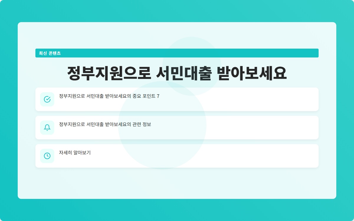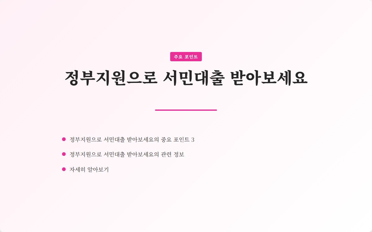 지금까지 정부지원으로 서민대출을 받을 수 있는 방법과 그 혜택에 대해 알아보았습니다. 요약하자면: - 정부지원 대출 프로그램을 활용하자. - 신용 상담 서비스를 통해 신용 개선을 도모하자. - 온라인 플랫폼을 통해 간편하게 대출을 신청하자. 이제 여러분도 정부의 지원을 통해 경제적 어려움에서 벗어날 수 있는 기회를 잡아보세요! 궁금한 점이 있다면 댓글로 남겨주세요. 도움이 필요하시면 언제든지 문의 바랍니다!