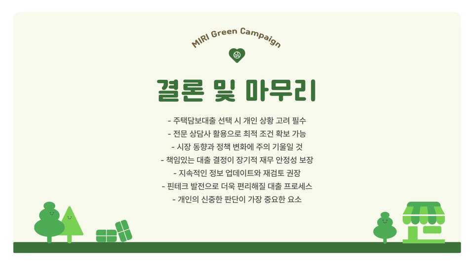 따라서 신뢰할 수 있는 상담사를 통해 다양한 정보를 수집하고, 신중하게 결정하십시오. 주택담보대출은 인생에서 가장 큰 재정 결정 중 하나입니다. 따라서 충분한 준비와 상담 후에 결정을 내려야 할 것입니다.