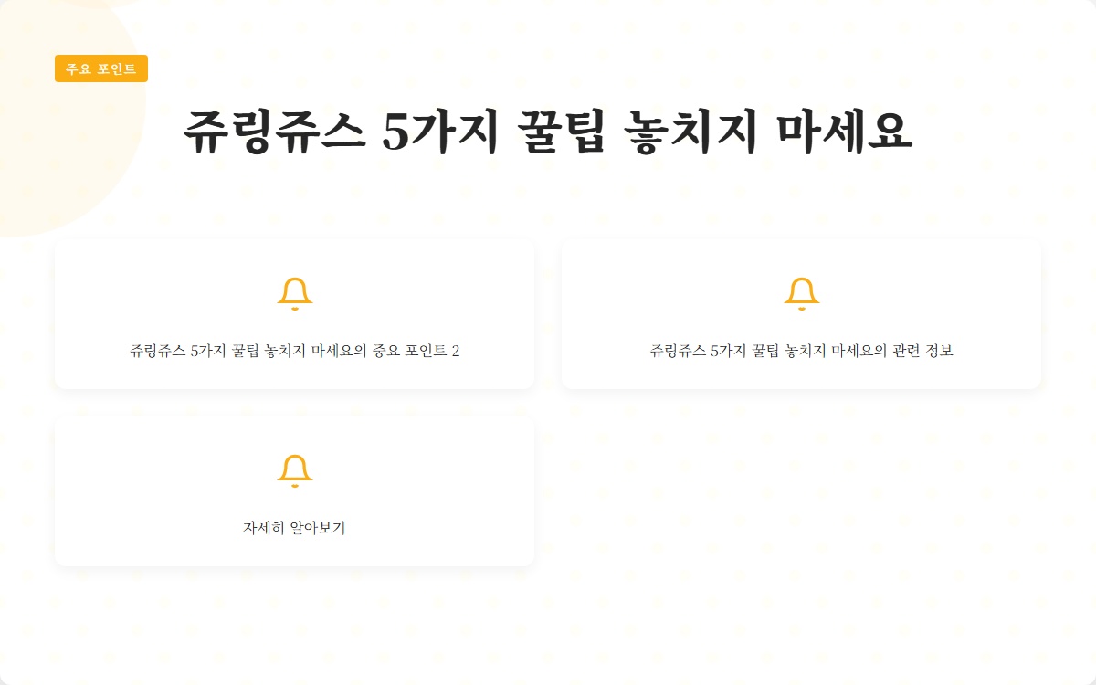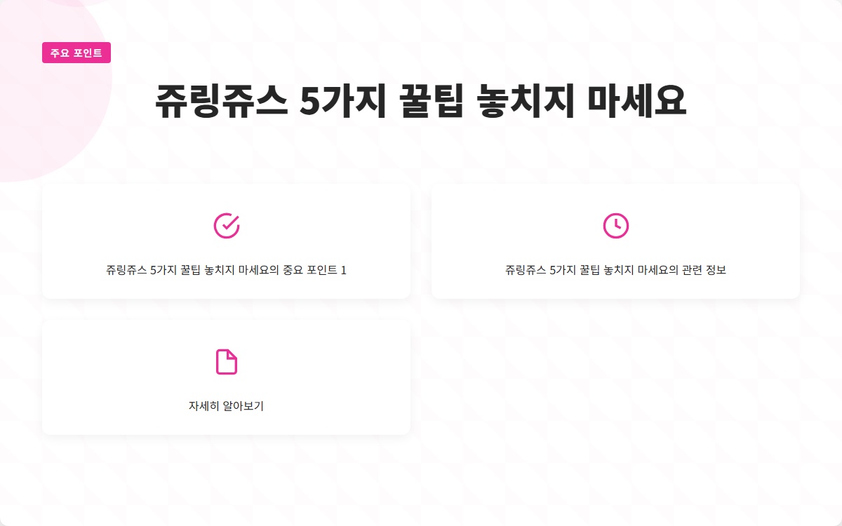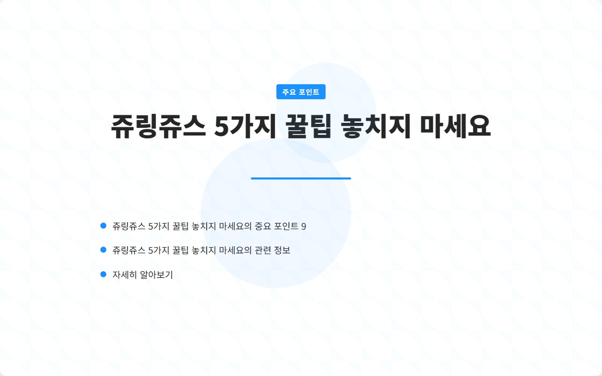 여러분은 쥬링쥬스를 제대로 활용하고 계신가요? 많은 사람들이 쥬링쥬스를 사용하면서도 그 효과를 제대로 느끼지 못하고 있습니다. 이 글을 통해 쥬링쥬스의 5가지 꿀팁을 소개할 예정입니다. 지금 확인해보세요!