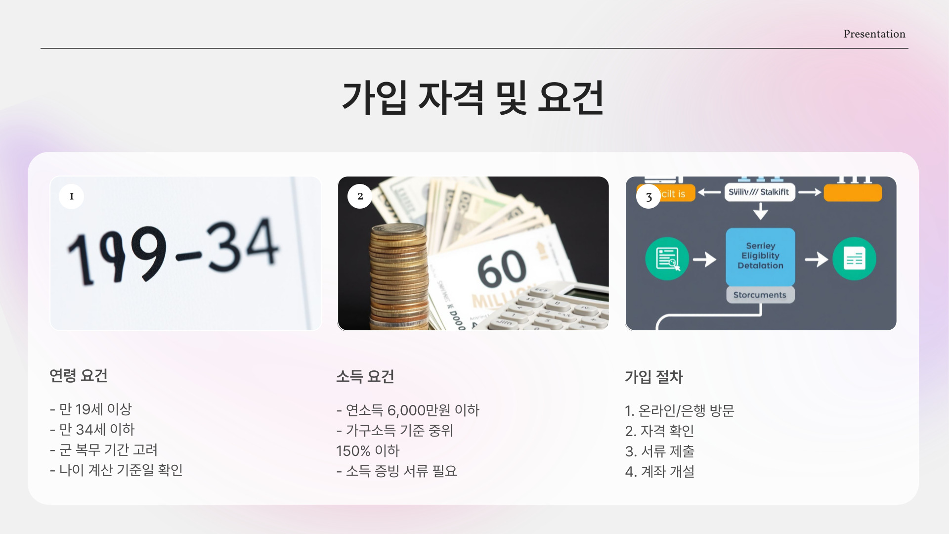 청년도약계좌에 가입하기 위해서는 몇 가지 요건을 충족해야 합니다. 먼저, 만 19세에서 34세까지의 청년이어야 하며, 소득 요건도 있습니다. 즉, 연간 소득이 일정 금액 이하인 경우에만 가입할 수 있습니다. 가입 절차는 간단하며, 은행을 방문하거나 온라인으로 신청할 수 있습니다. 필요한 서류는 신분증과 소득 증명 서류 등이 있으며, 이러한 서류를 준비하여 신청하면 됩니다.
