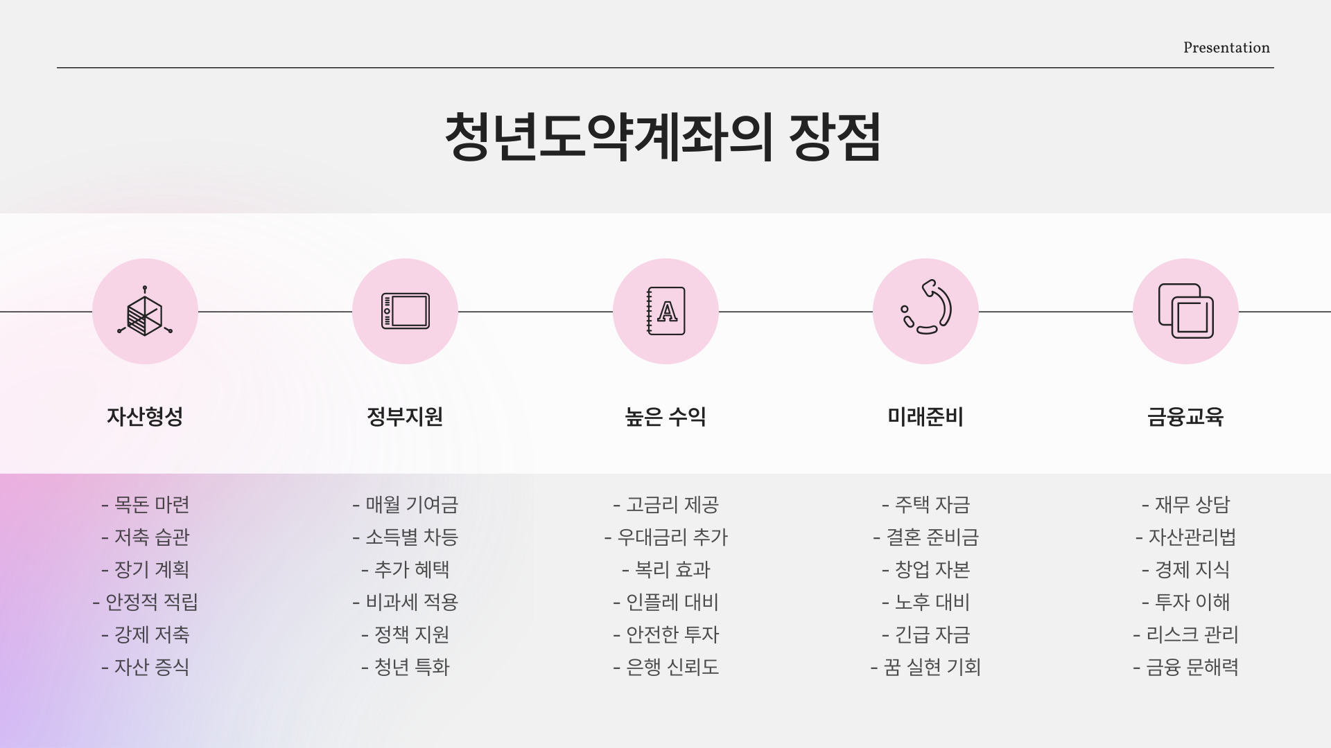 청년도약계좌의 가장 큰 장점은 정부의 지원금을 받을 수 있다는 점입니다. 예를 들어, 매달 일정 금액을 저축하면 정부가 추가로 지원해 주는 방식입니다. 이러한 지원은 청년들에게 큰 도움이 되며, 저축의 동기를 부여합니다. 또한, 장기적으로 자산을 형성할 수 있는 기회를 제공하므로, 청년들이 보다 안정적인 미래를 계획할 수 있도록 합니다.