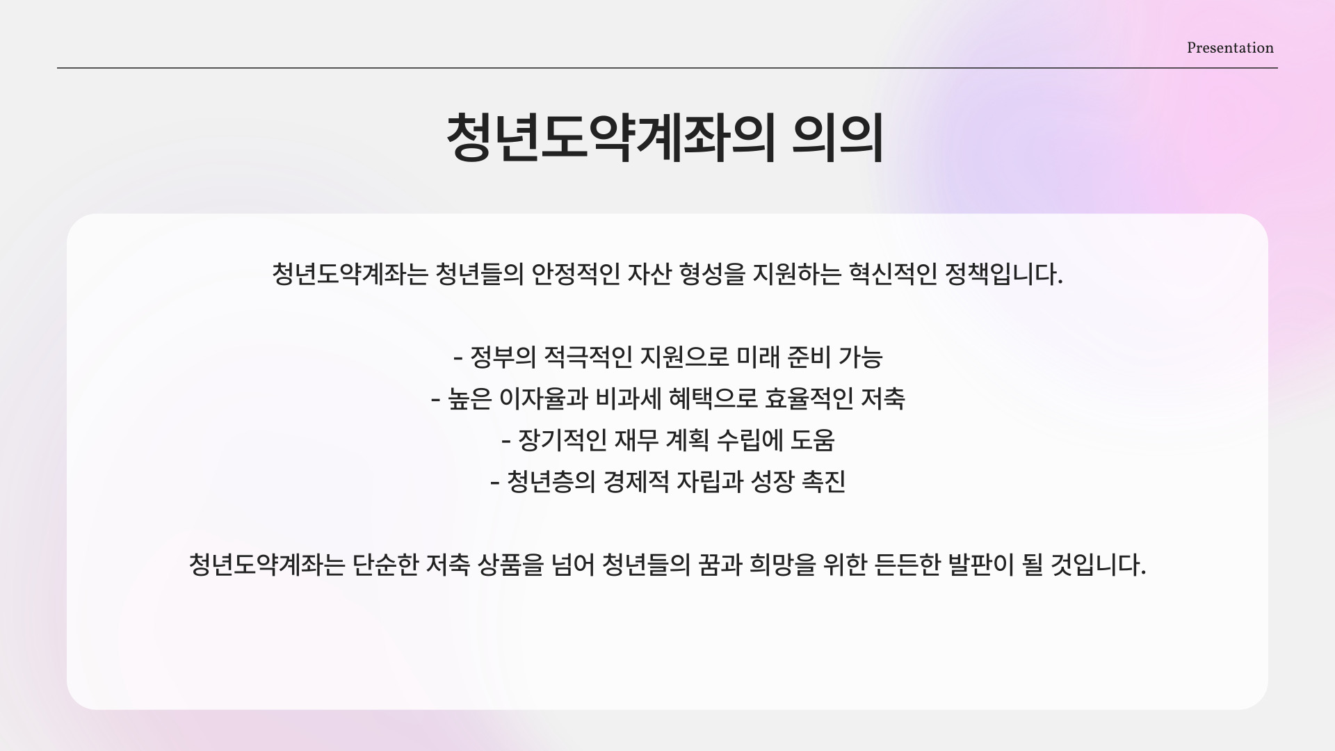 청년도약계좌는 청년들에게 큰 희망이 될 수 있는 제도입니다. 이를 통해 경제적인 독립을 이루고, 미래의 다양한 기회를 준비할 수 있습니다. 오늘부터 시작하는 청년도약계좌에 많은 관심과 참여를 부탁드립니다. 저축은 미래를 위한 투자이며, 청년들이 자신의 꿈을 이루는 데 중요한 첫걸음이 될 것입니다.
