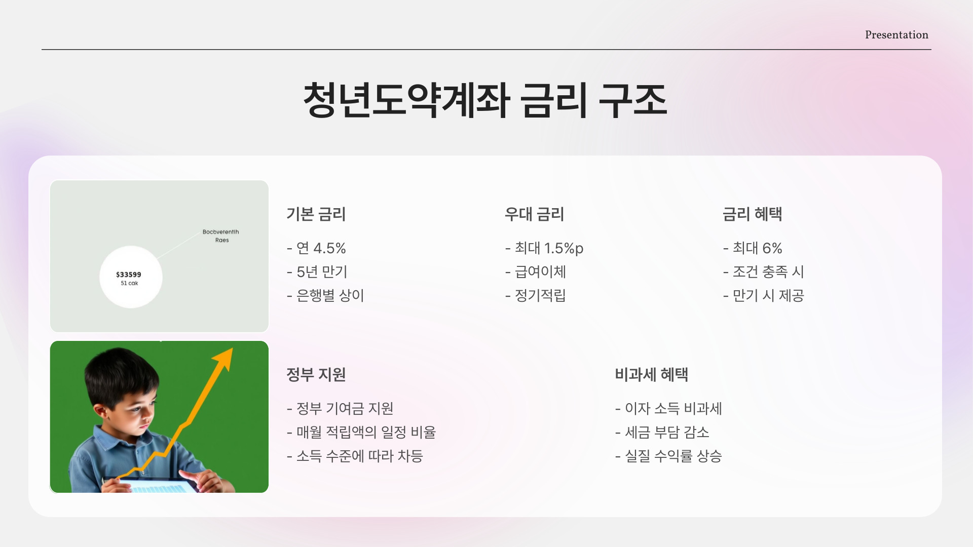 청년도약계좌는 여러 가지 이점을 제공합니다. 첫 번째로는 정부의 지원금입니다. 일부 연령대에 해당되는 청년들은 계좌에 매달 일정 금액을 저축할 경우, 정부로부터 추가 지원금을 받을 수 있습니다. 이는 실질적인 저축 금액을 늘리는 데 큰 도움이 됩니다. 또한, 청년들은 다양한 금융 교육 프로그램을 통해 자산 관리에 대해 더 깊이 배우게 됩니다.
