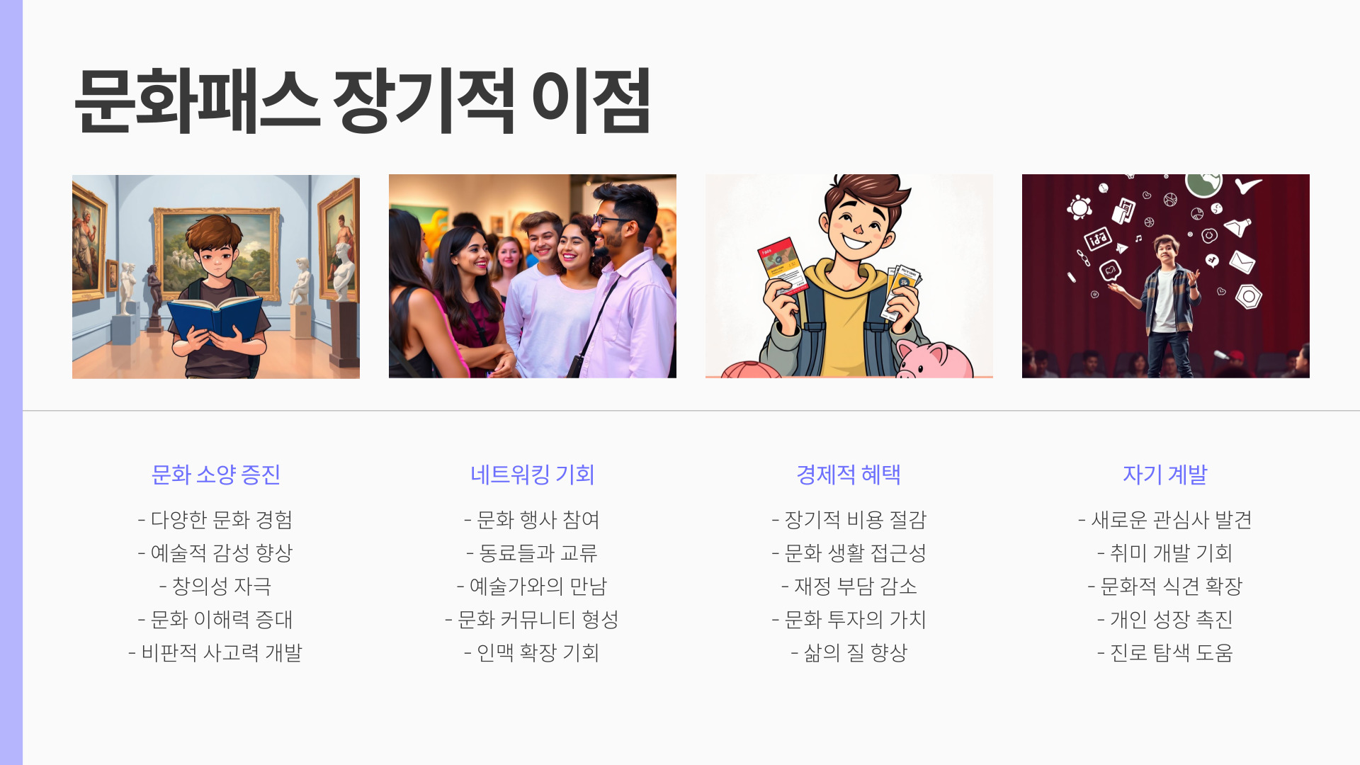 청년문화패스의 가장 큰 장점은 경제적인 부담을 줄여준다는 것입니다. 문화 활동에 소요되는 비용을 절감할 수 있어, 청년들이 다양한 문화 경험을 할 수 있도록 돕습니다. 또한, 이 패스를 통해 새롭게 열리는 문화 행사나 특별 프로그램에 참여할 수 있는 기회도 늘어납니다. 예를 들어, 특정 공연에 대한 할인 혜택이나 사전 예약 기회는 청년들에게 매우 소중한 경험을 제공합니다.