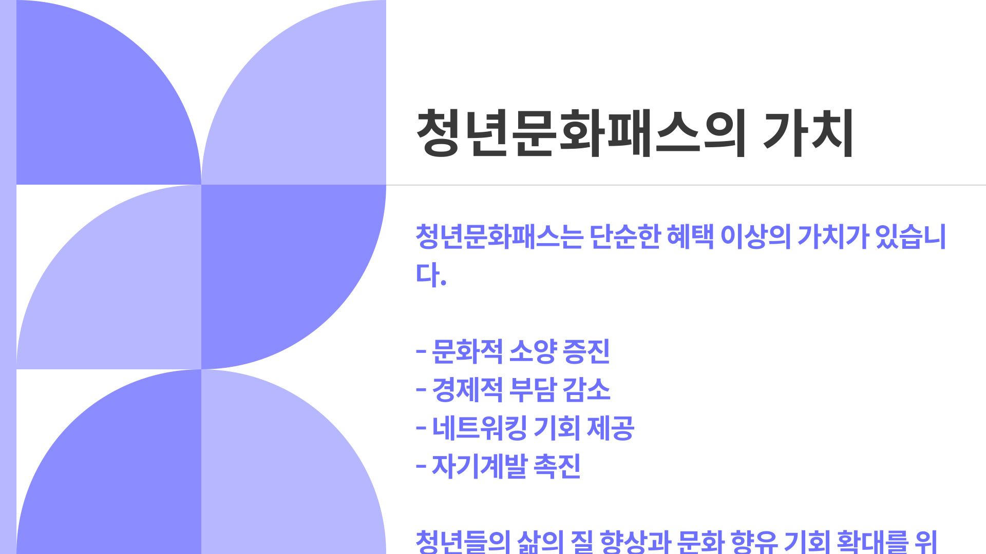 청년문화패스는 청년들이 문화 활동에 적극적으로 참여할 수 있도록 돕는 훌륭한 프로그램입니다. 다양한 혜택과 기회를 제공함으로써, 청년들이 문화적 소양을 키우고, 새로운 경험을 쌓을 수 있도록 해줍니다. 이 패스를 놓치지 마세요! 청년문화패스를 적극 활용하여 풍성한 문화생활을 즐기길 바랍니다.