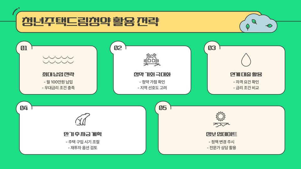청년주택드림청약은 청년들에게 많은 기회를 제공하는 프로그램으로, 올바른 정보와 절차를 통해 신청하면 내 집 마련의 꿈을 이룰 수 있습니다. 각 단계마다 꼼꼼히 준비하고, 필요한 서류를 빠짐없이 준비하는 것이 성공의 열쇠입니다. 지속적으로 정보를 업데이트하고, 청년주택드림청약에 대한 관심을 잃지 않는 것이 중요합니다. 청년 여러분의 주거 안정과 행복한 미래를 기원합니다!