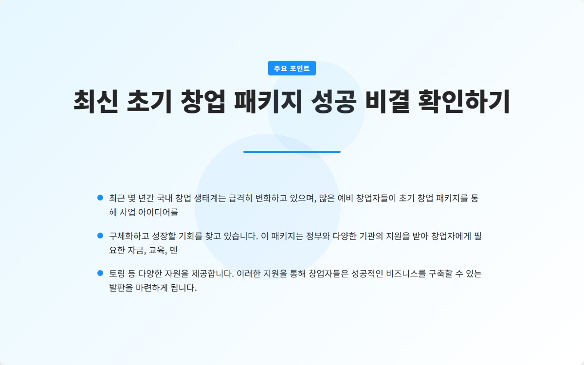 이처럼 초기 창업 패키지는 창업자에게 귀중한 자원입니다. 성공적인 창업을 위해서는 이 패키지를 효과적으로 활용하고, 지속적인 학습과 개선을 통해 비즈니스를 성장시켜 나가는 것이 필요합니다.